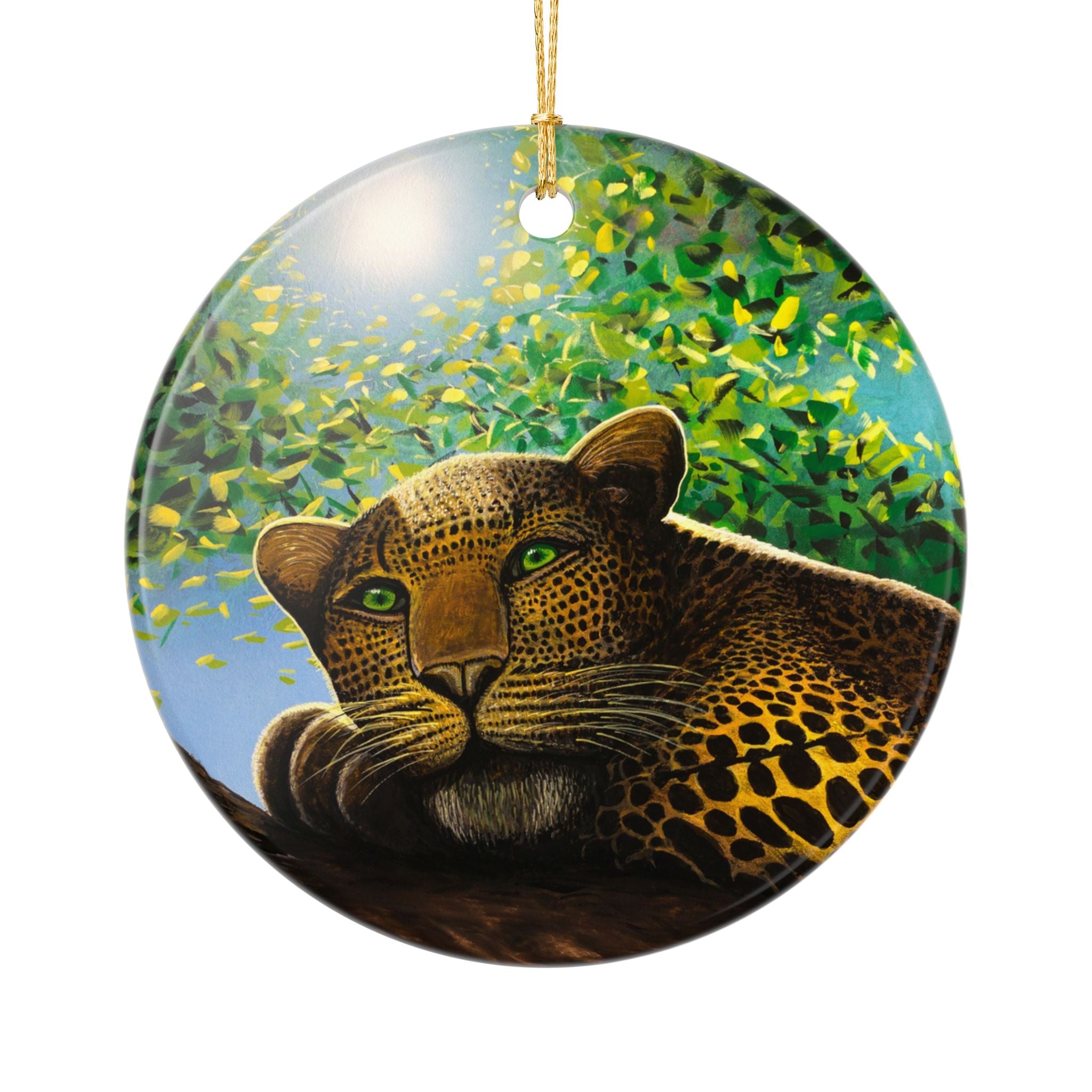 Hand-painted warmth in glossy ceramic — this round ornament captures a watchful leopard lounging beneath leafy canopy light. The two-sided print shows the same rich illustration on both faces so the image reads beautifully from every angle. Hung by a gold string, it brings a touch of wild elegance to a holiday tree, a window, or a gallery wall. The colors are vivid: forest greens, sunlit blues, and warm tawny spots that draw the eye. It feels like a quiet moment stolen from the savanna, ready to punctuate cozy evenings or nature-themed celebrations with a painterly, intimate presence.