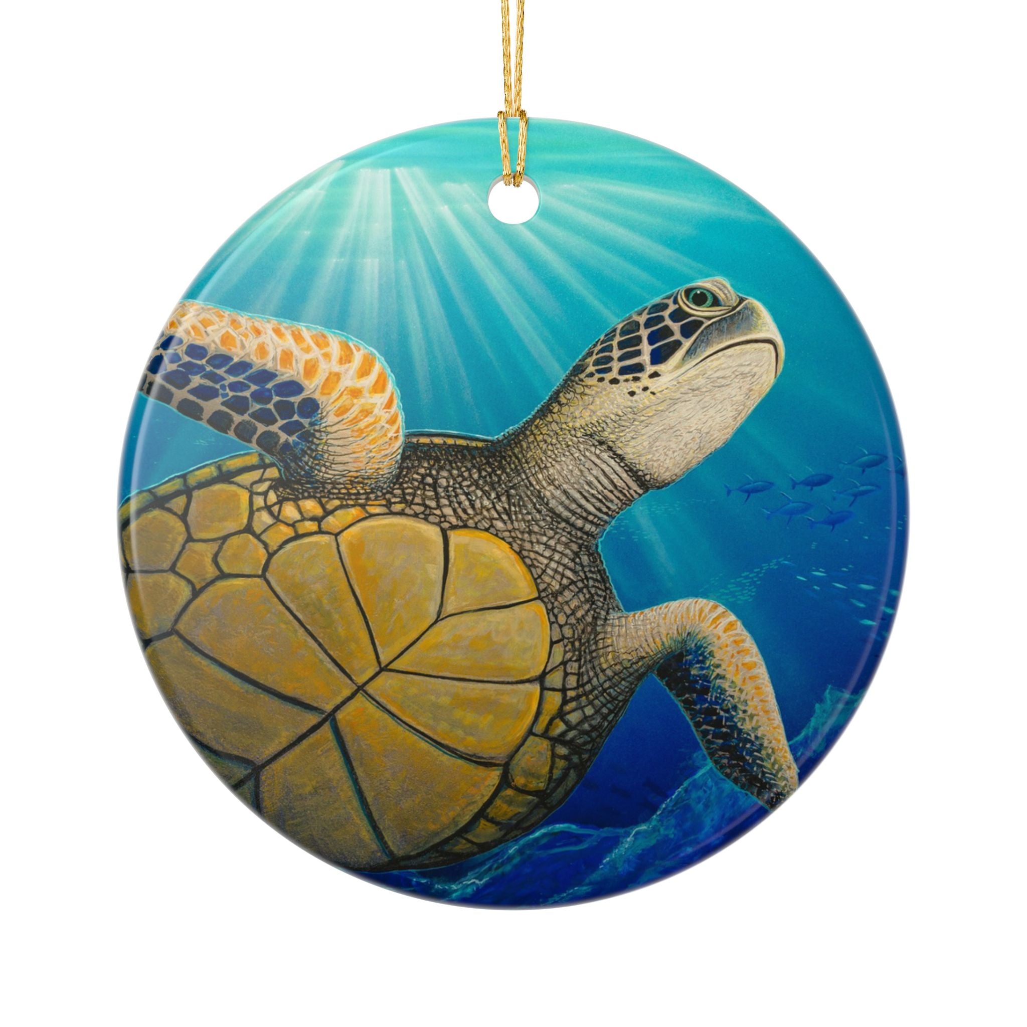 Glide into quiet blue afternoons with this ceramic ornament that holds a forever-summer hush. A sea turtle swims through shafts of light on both sides, its warm amber shell and steady gaze bringing calm and curiosity to any space. Hang it where sunlight can catch the glaze — it reads like a small window to the ocean, sparking memories of shoreline walks, snorkeling days, and slow, deliberate breaths.