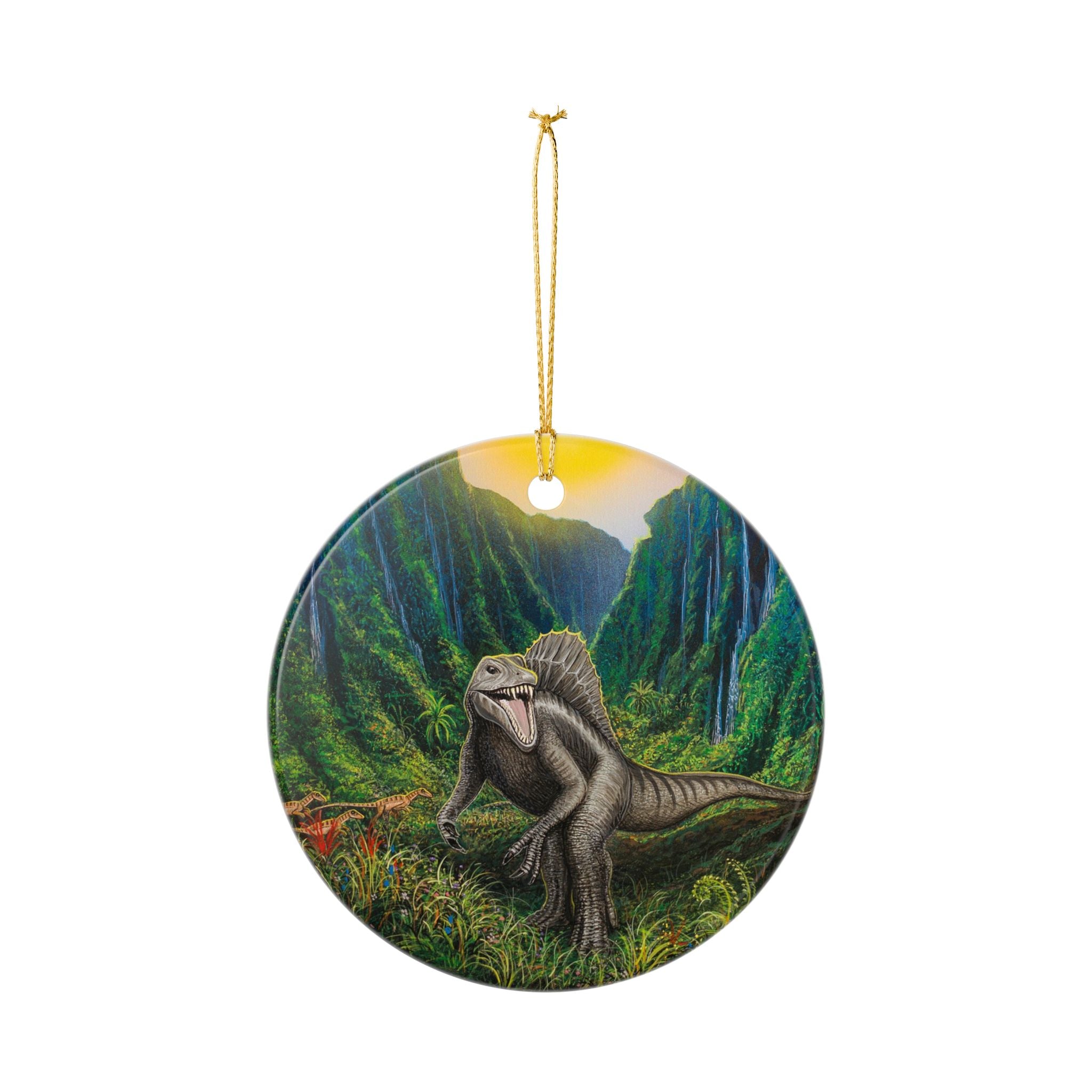 Hand-painted jungle light filters through misty valleys as a curious dinosaur surveys a lush, fern-filled clearing. This round ceramic ornament brings a tiny, enchanted scene to your tree or wall — bright colors, fine detail, and a glossy finish that catches holiday lights. Hang it with the included gold string where it can stir imaginations: on a holiday branch, in a child’s room, or as a playful accent in a nature-themed display. The sturdy ceramic face holds the artwork on both sides, so the scene delights from every angle and keeps its vibrant tones year after year.