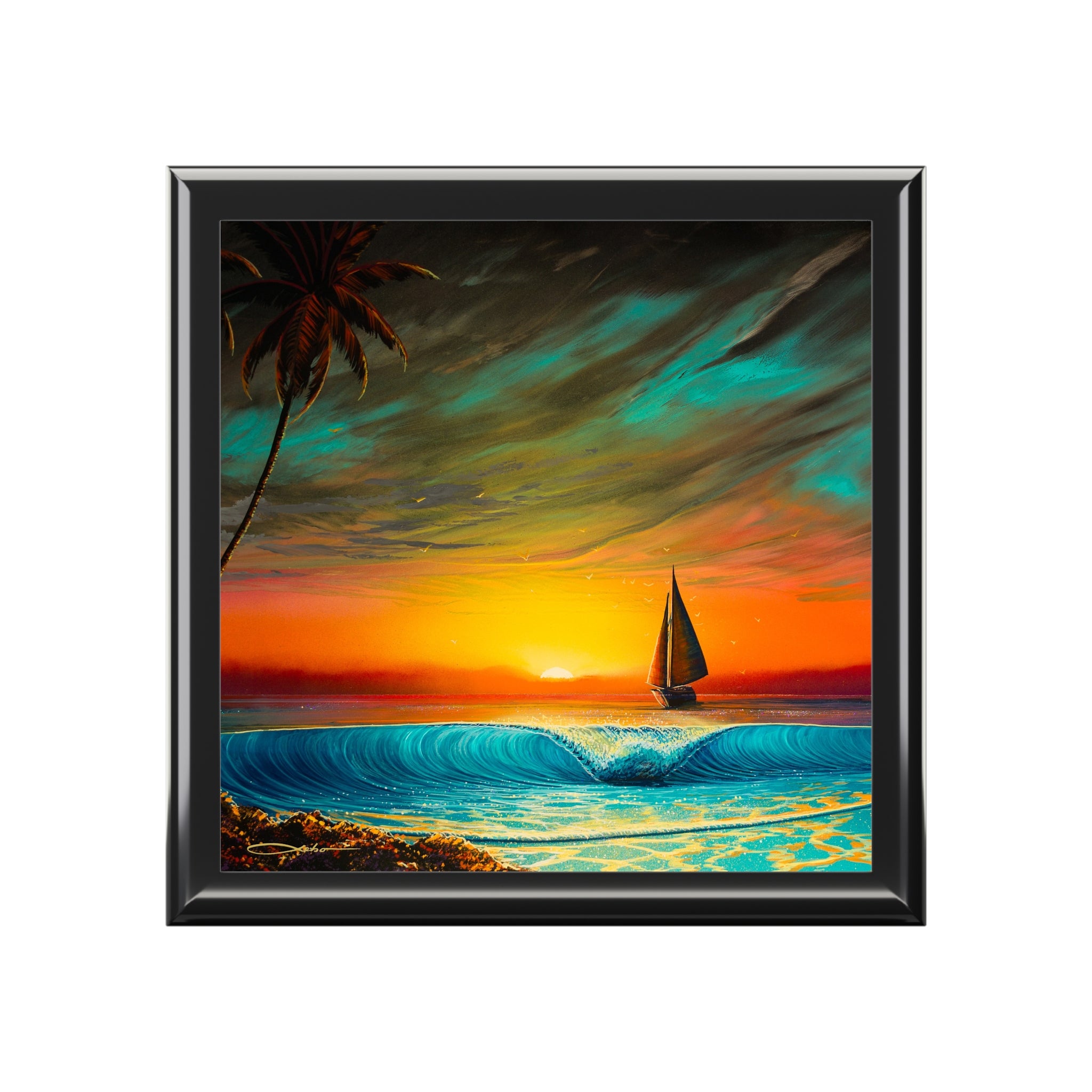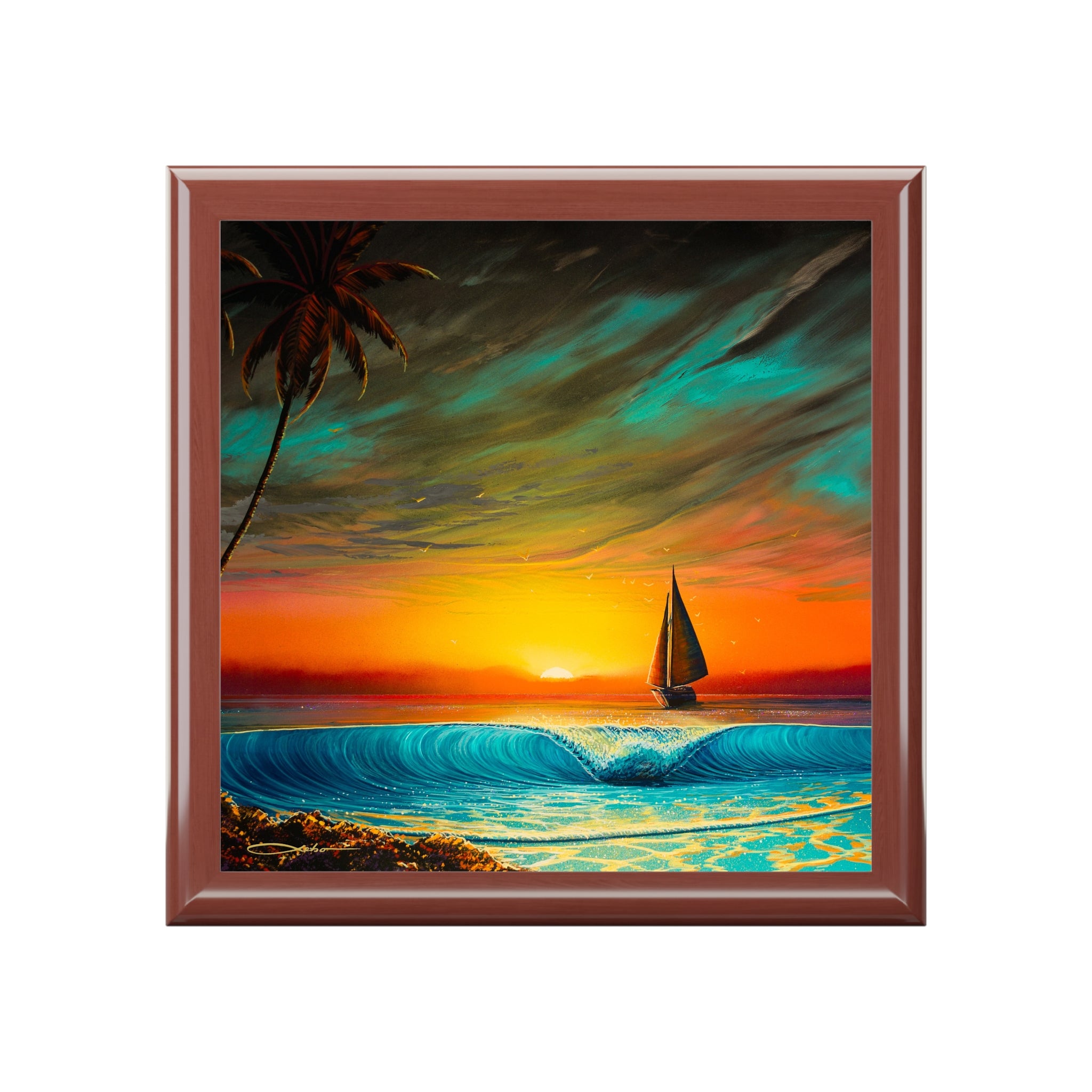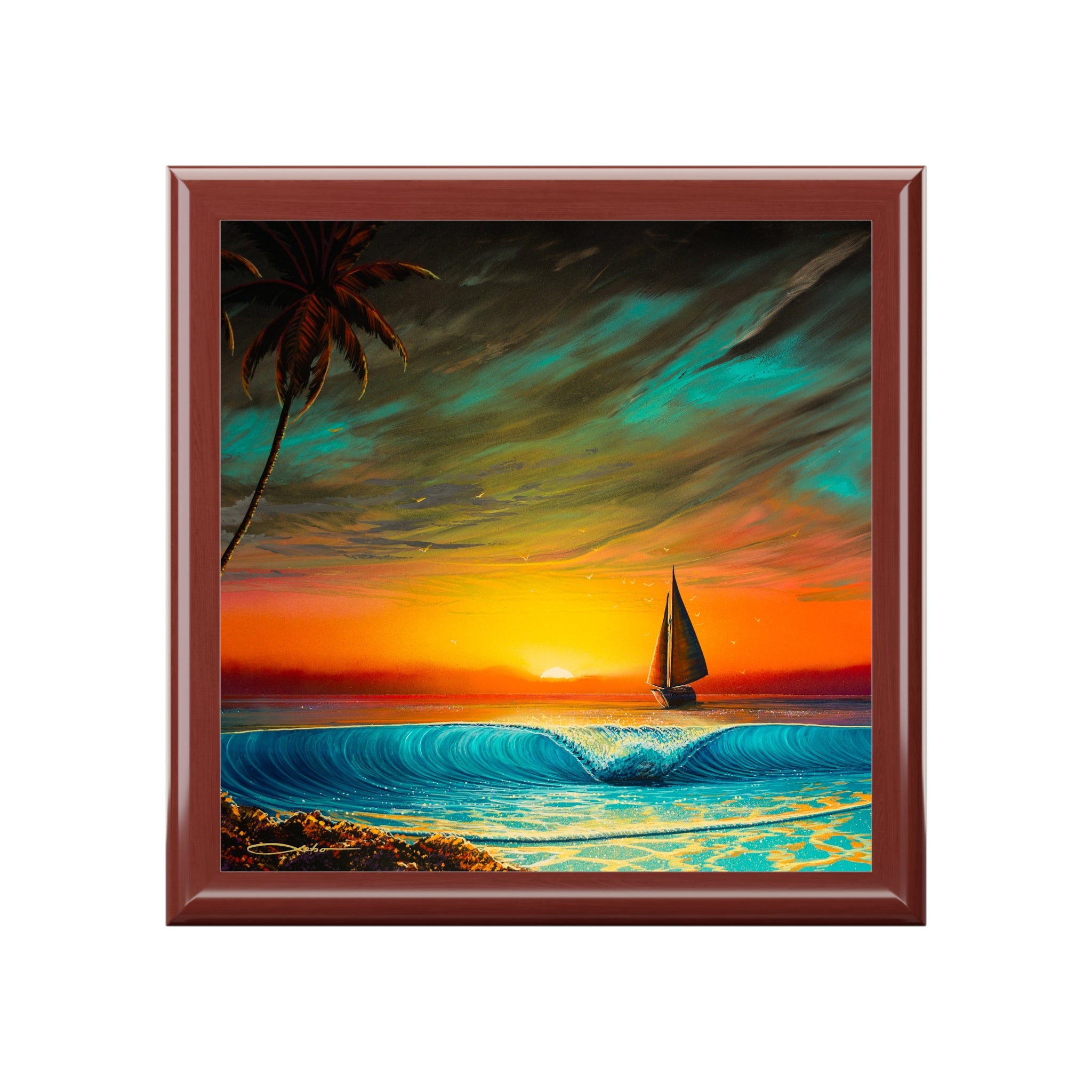 Product features - 6" x 6" glossy sublimation ceramic tile with vibrant sailboat sunset artwork - High-quality rubberwood case with durable varnish and glossy finish - Interior lined with soft felt to protect jewelry - Dual hinges that lock the lid open at a 90° angle - Slip-resistant felt base prevents sliding on surfaces