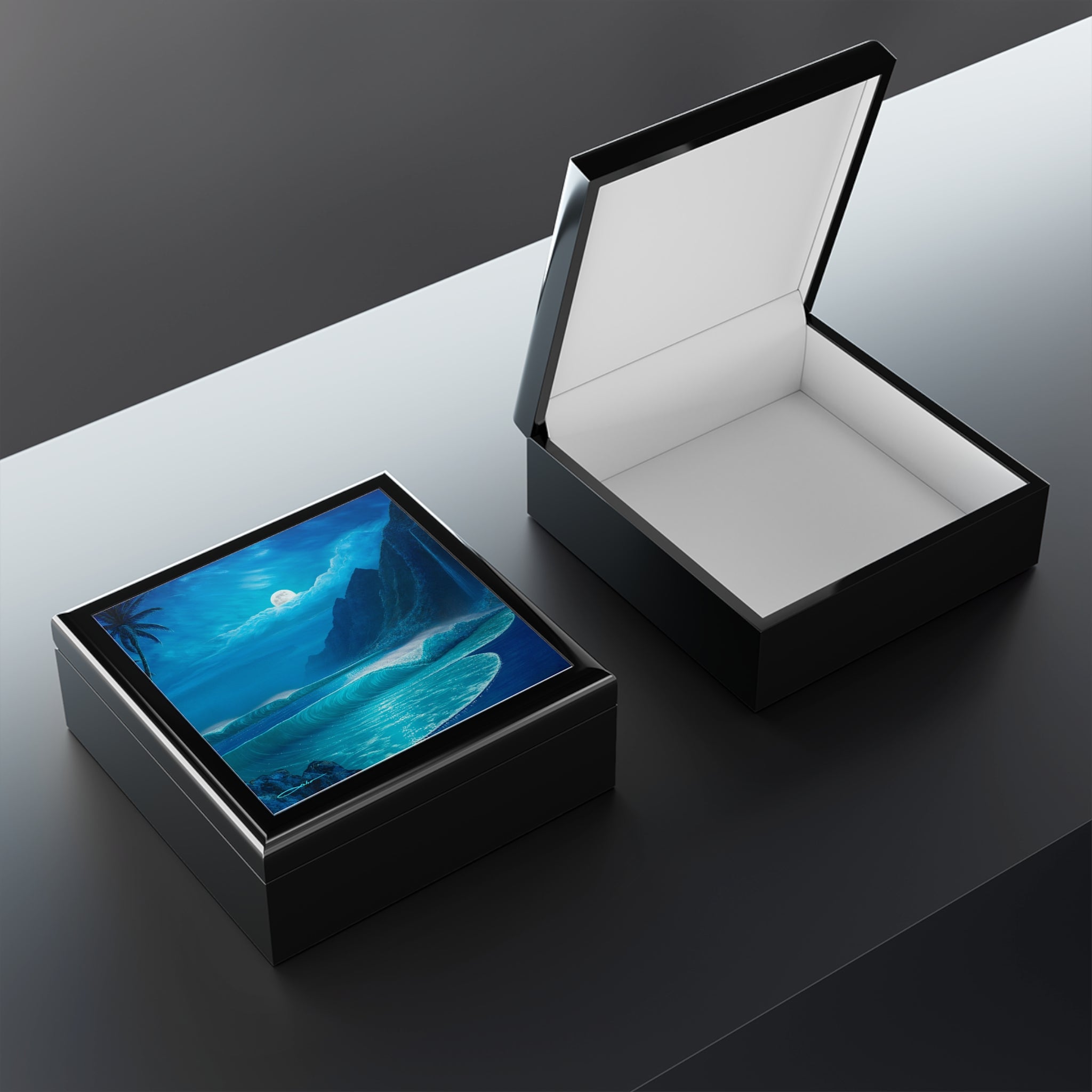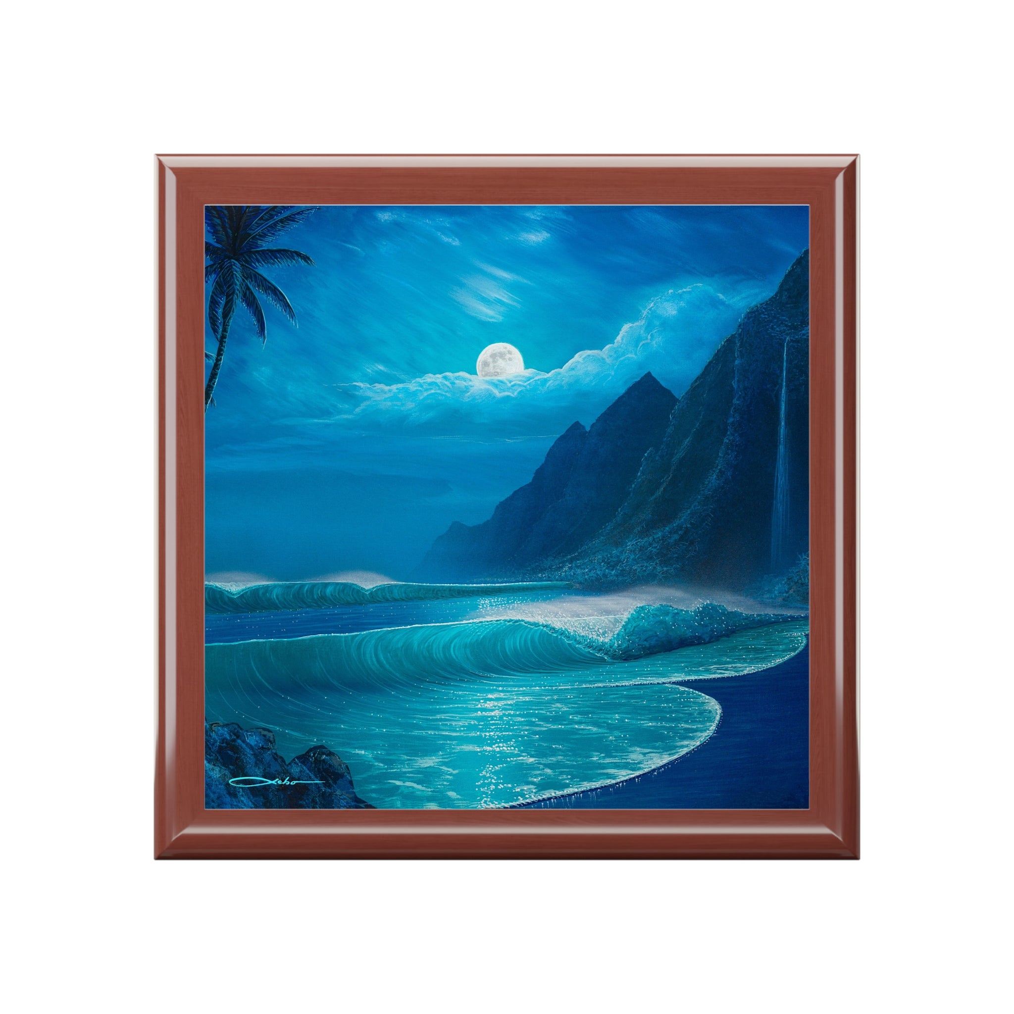This handcrafted jewelry box brings calm nights and ocean hush to your dresser. Smooth, glossy rubberwood in your choice of three deep hues cradles a 6" square ceramic tile on the lid — a luminous coastal scene that catches the light and holds attention. Open the dual-hinged lid to a soft felt interior where rings, chains, and keepsakes rest without scratches. The box stays put on vanities and shelves thanks to a slip-resistant felt base. It’s an everyday piece that feels thoughtful: honed wood, a reflective finish, and a small framed artwork that makes storing jewelry feel like a quiet ritual.
