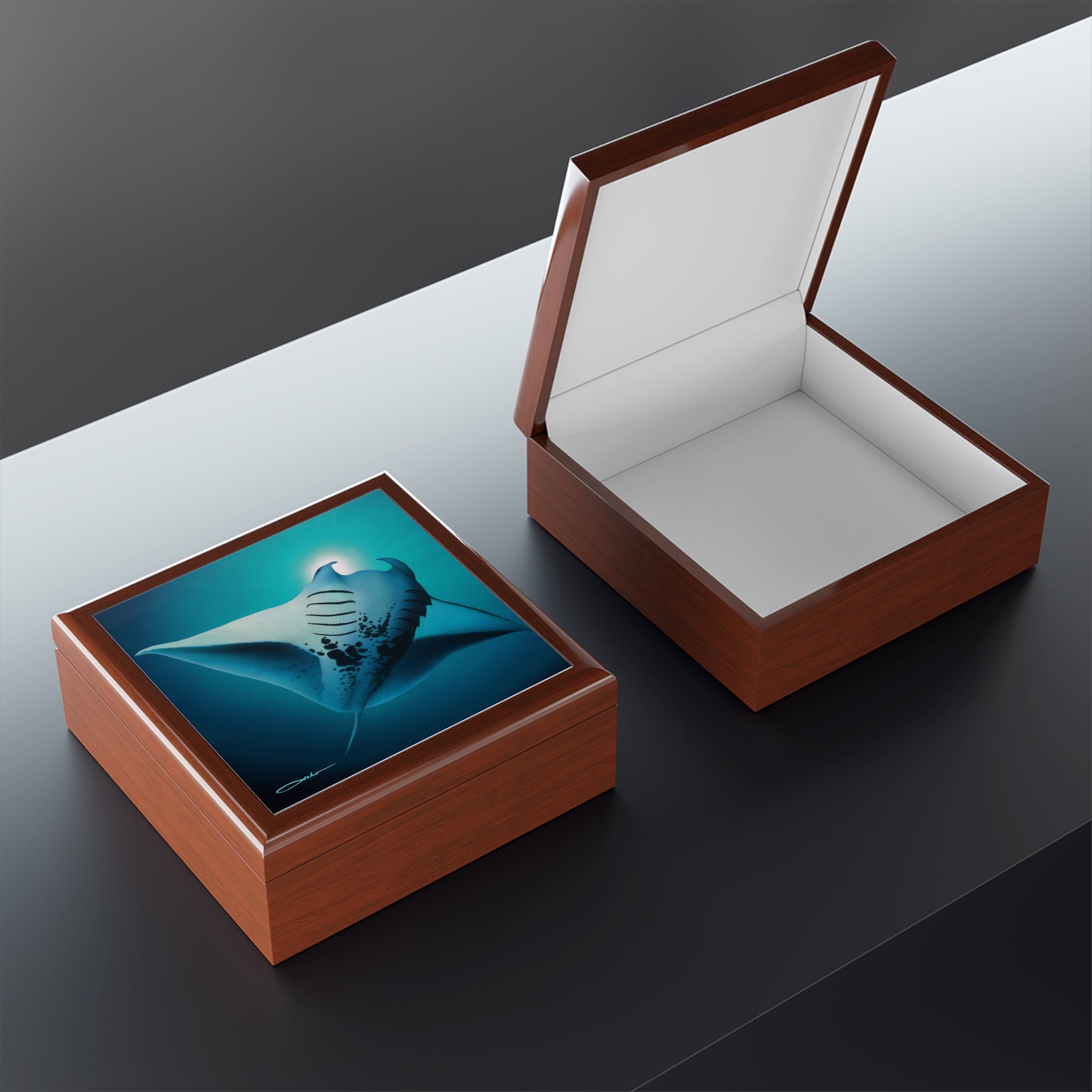 This compact jewelry box brings the calm of the sea to a bedside or vanity. Solid rubberwood with a glossy varnish gives the piece weight and a polished look, while a vivid 6" ceramic tile showing a manta ray gliding through turquoise depths creates a quiet, contemplative focal point. The lid stays open at 90° thanks to dual hinges, and the interior is lined with soft felt to cradle rings, chains, and keepsakes. A slip-resistant felt base keeps the box steady on dressers or bathroom counters. Choose from three glossy color options to match your décor and make this small, sculptural box part of your everyday ritual.