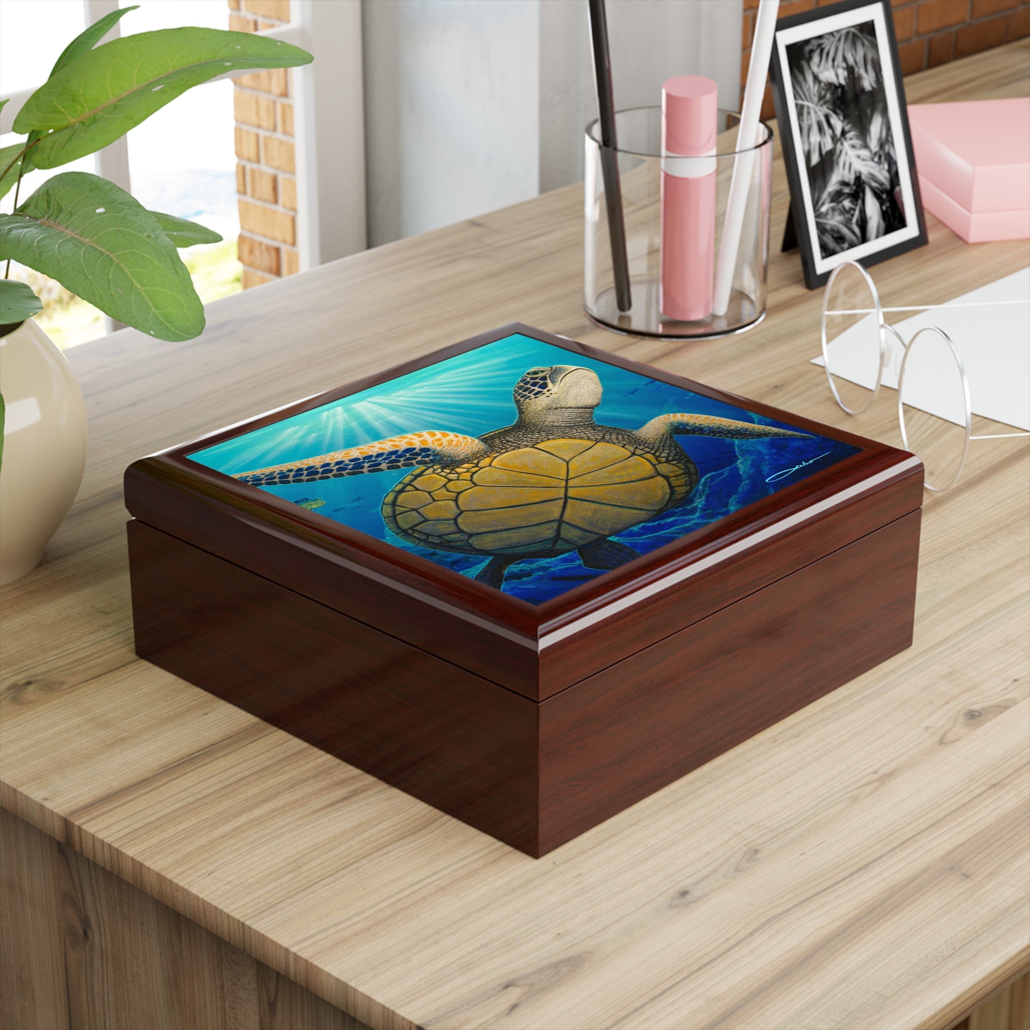 Quiet and luminous, this handcrafted jewelry box brings the ocean to your dresser. Smooth rubberwood with a deep varnish catch the light, while a glossy ceramic tile on the lid showcases a sunlit sea turtle gliding beneath the waves. Open the dual-hinged lid that locks at 90° to reveal a soft felt interior that cushions earrings, rings, and keepsakes. The felt base keeps the box steady on wood or glass surfaces, and the available glossy colors let you choose a look that fits your space. It’s the kind of small, thoughtful object that turns everyday routines—sliding a ring back on, tucking away a brooch—into moments of calm and connection to the sea.