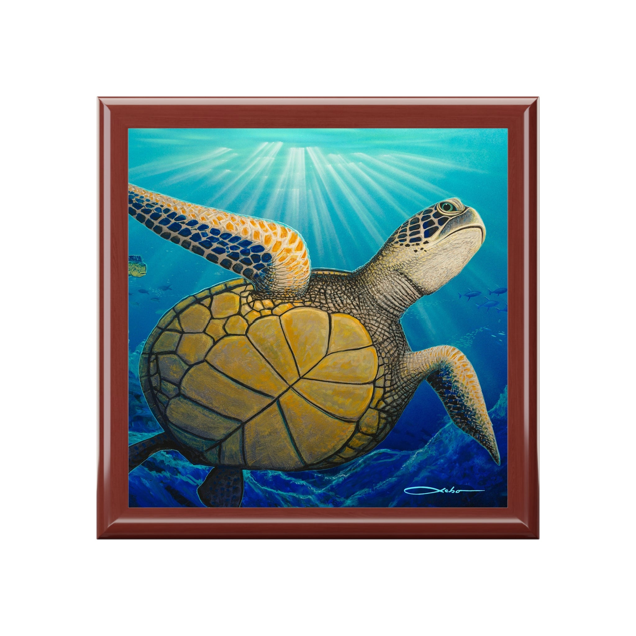 - 6" glossy ceramic tile with underwater turtle artwork on lid