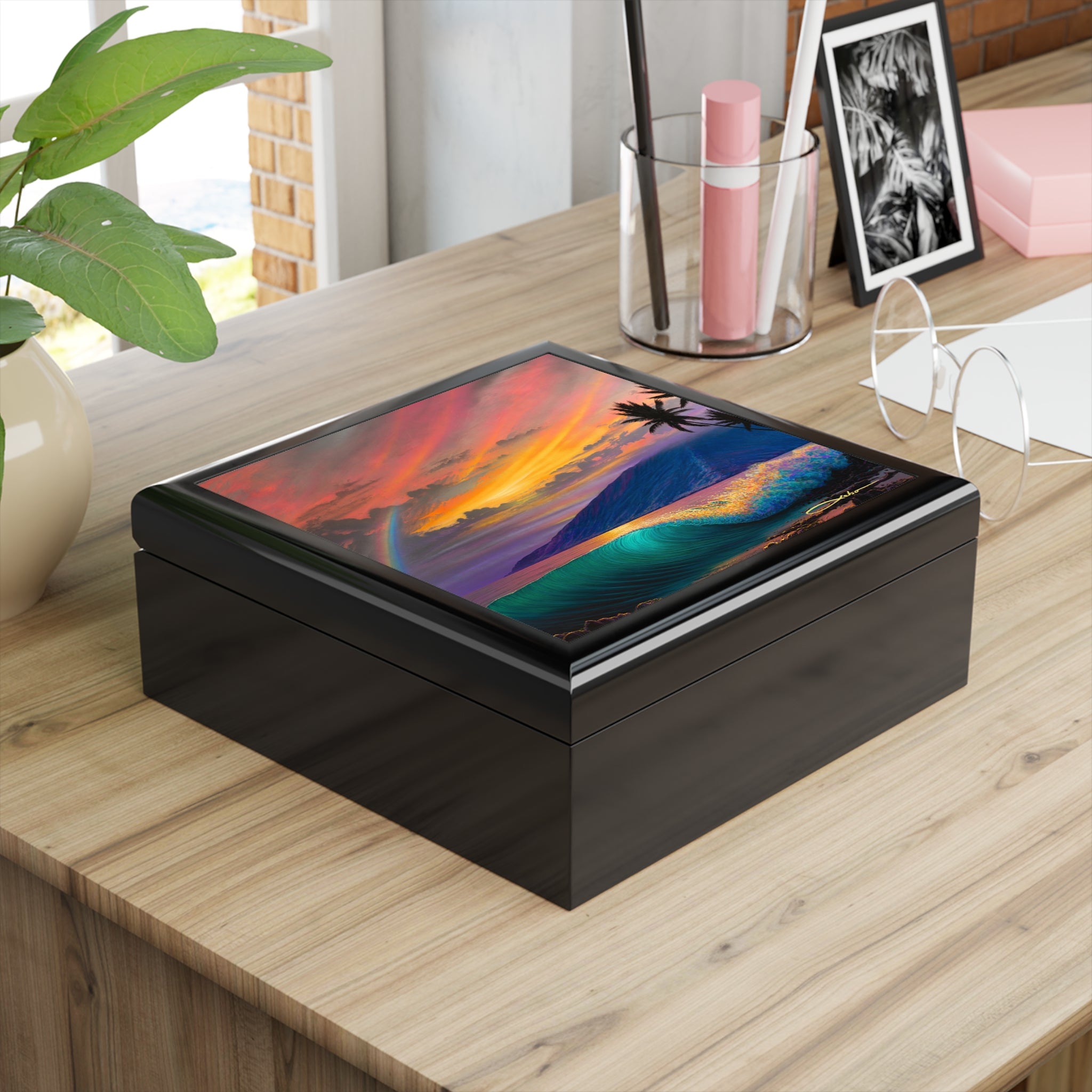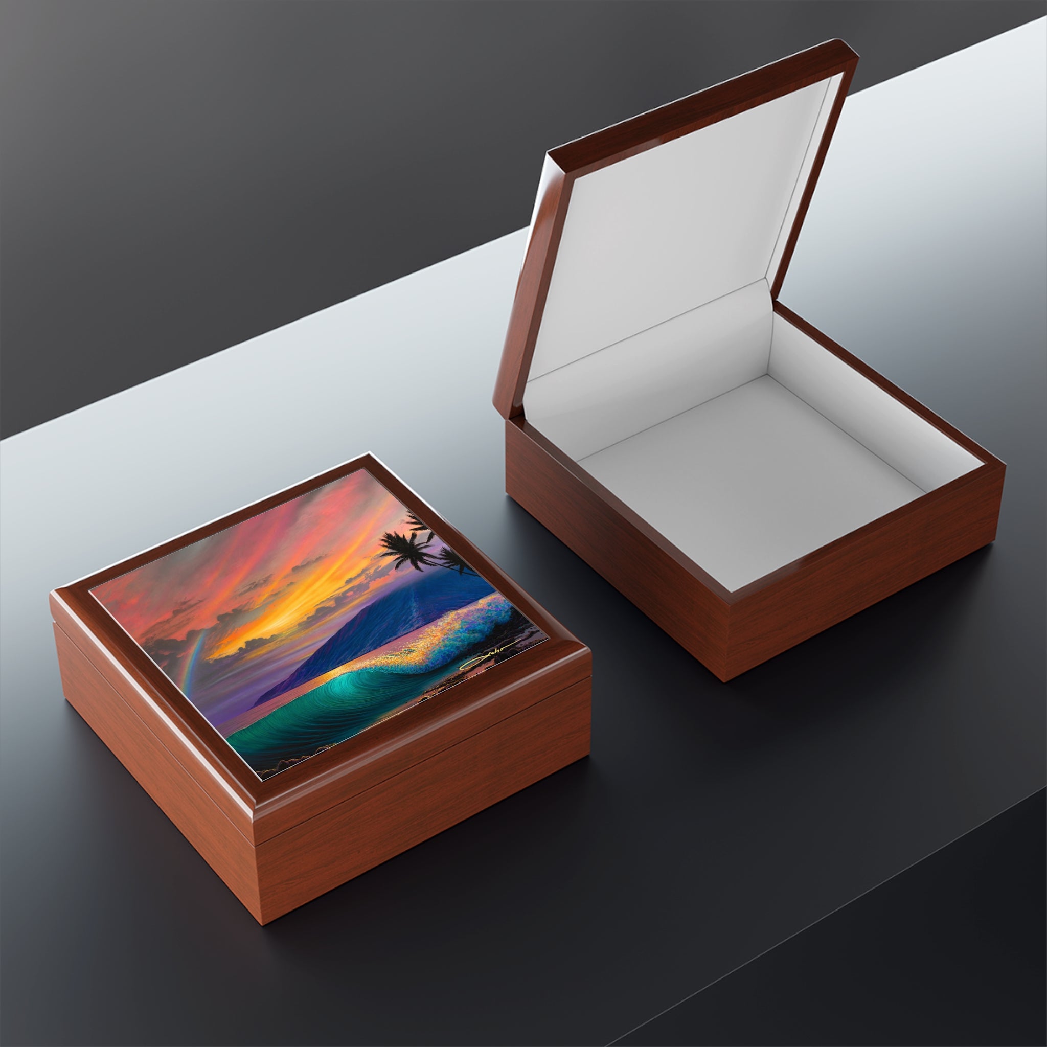 A compact jewelry box that brings a slice of ocean sunset into everyday moments. The high-gloss rubberwood case reflects soft light while the vivid 6" ceramic tile lid captures a colorful wave, palm silhouettes, and a glowing sky. Inside, the soft felt lining cradles rings, chains, and keepsakes; dual hinges hold the lid steady at 90° for easy access. The felt base keeps the box in place on dressers or vanities. It’s for someone who loves coastal color and thoughtful craftsmanship — a small, tactile way to store treasures and brighten a morning routine.