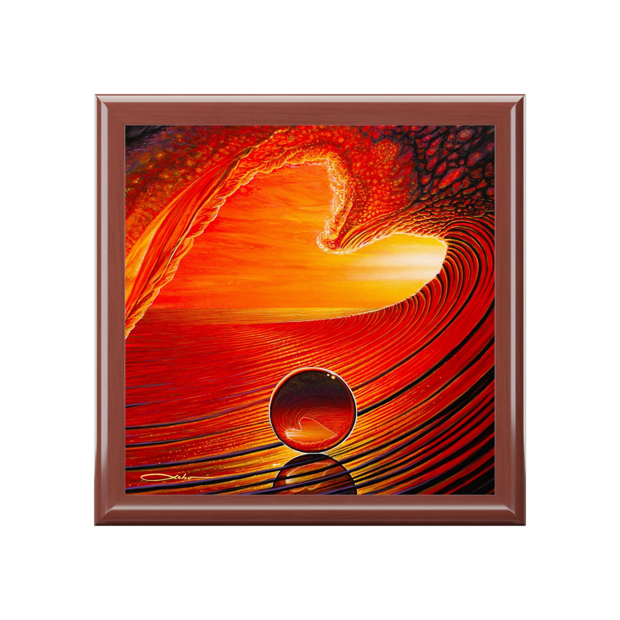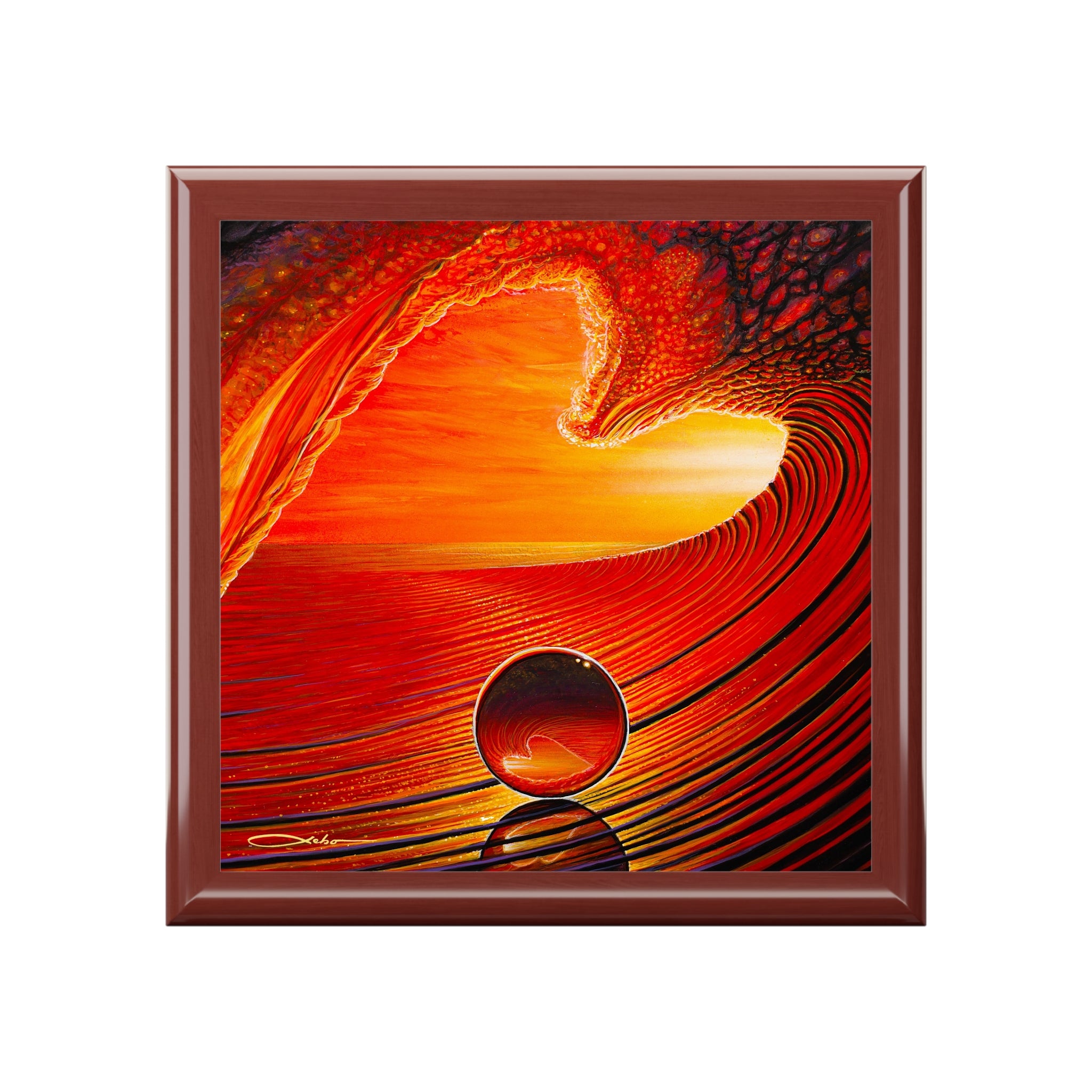 This glossy wooden jewelry box brings warmth and color to a dressing table. The 6" ceramic tile on the lid captures a sunset-like swirl of reds and golds that catches the eye. Inside, soft felt cradles rings and chains while dual hinges hold the lid steady at 90°. The slip-resistant felt base keeps the box safely in place on wood or glass surfaces. Choose from three glossy color options to match a vanity or shelf — the compact 6" square footprint fits neatly into small spaces while presenting a striking focal point.