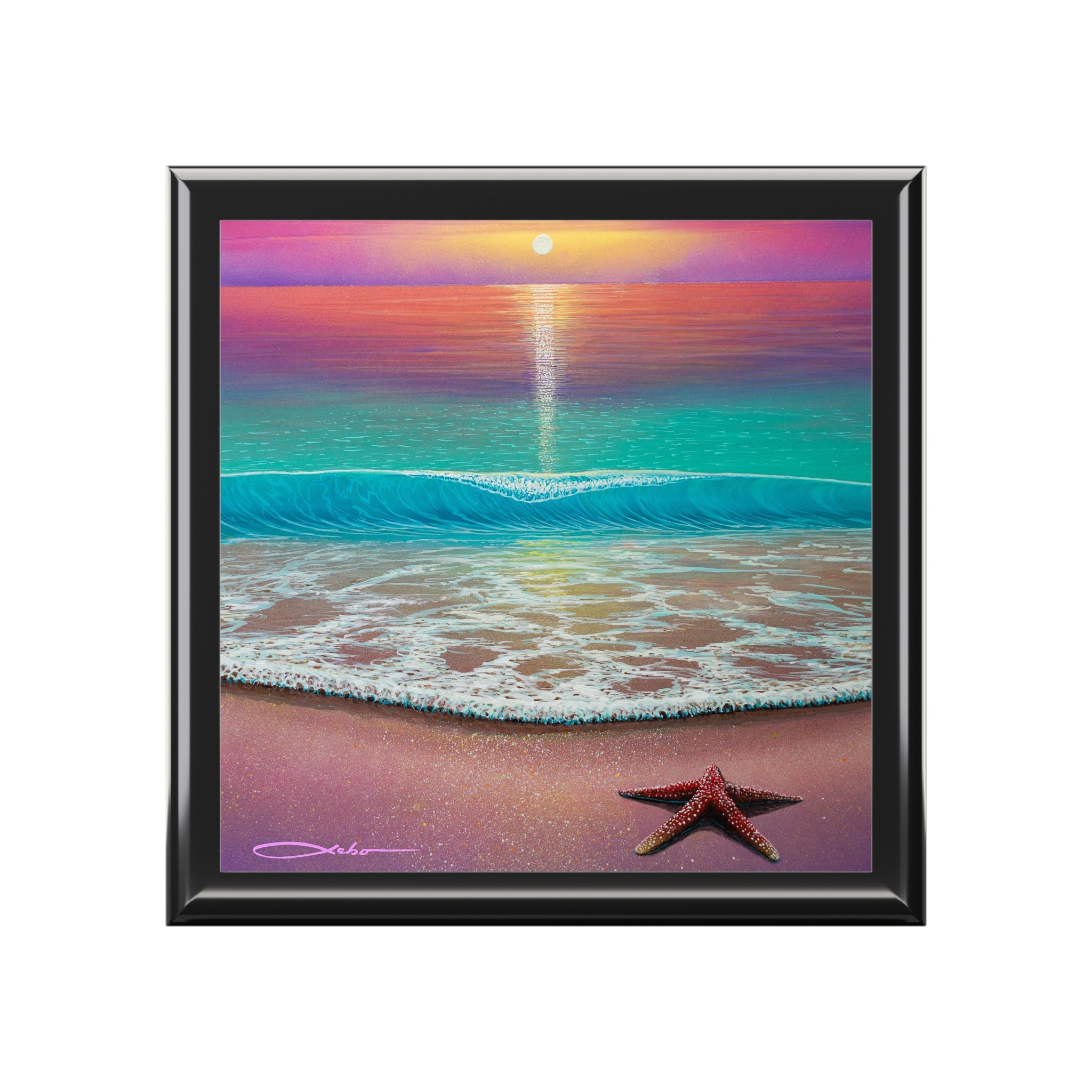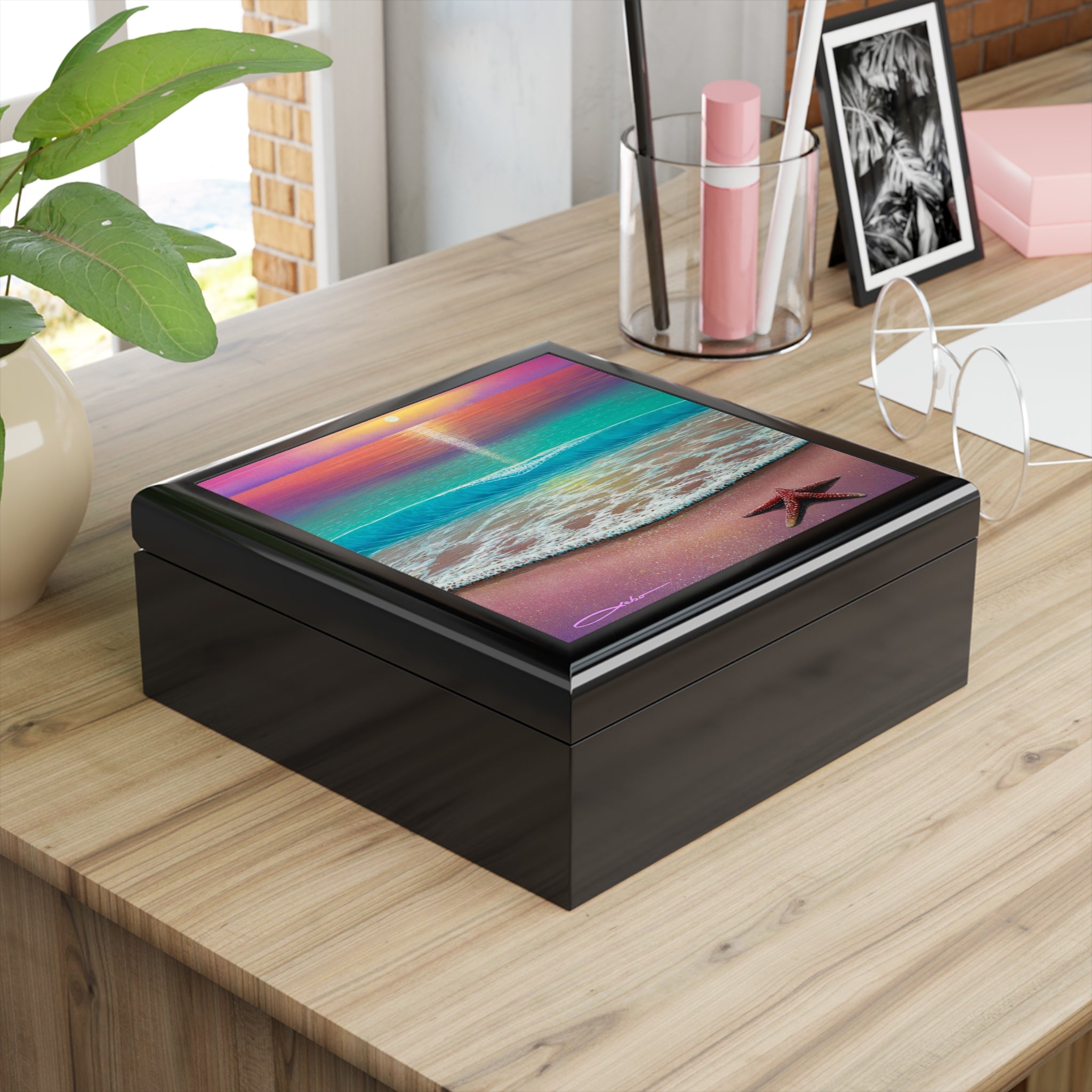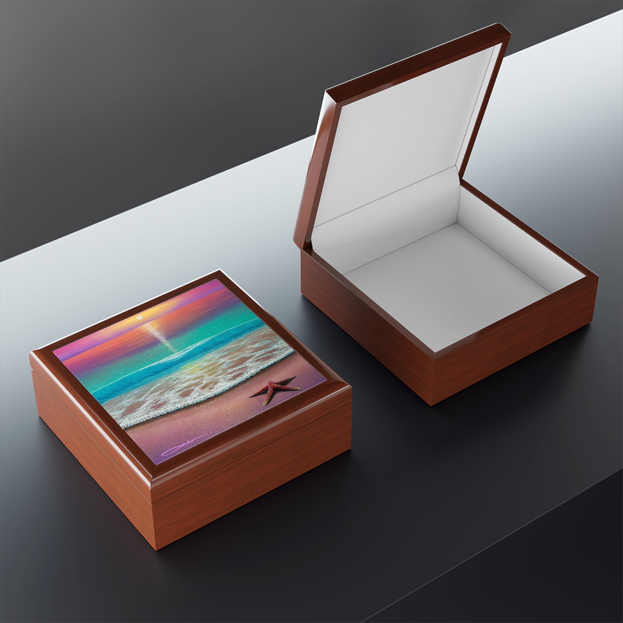 Product features - 6" x 6" glossy sublimation ceramic tile with vibrant beach artwork on lid - High-gloss varnished rubberwood body available in three colors - Interior lined with soft felt to protect jewelry - Dual hinges that lock the lid at a 90° open angle - Slip-resistant felt base to keep the box in place