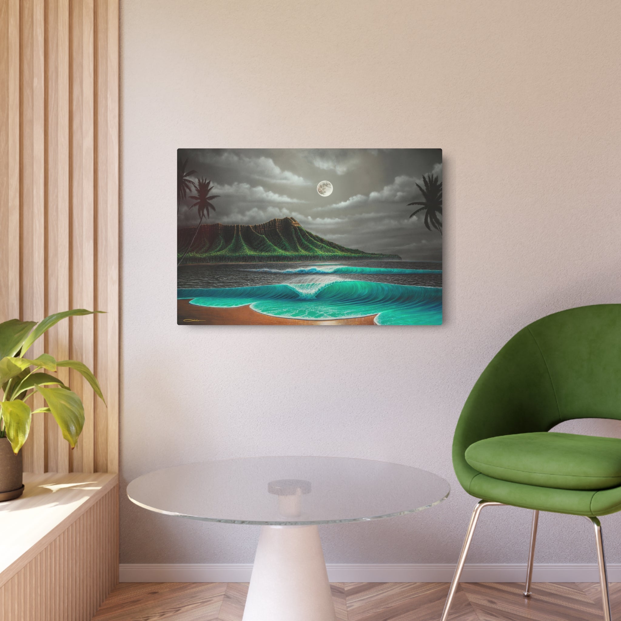 Bring the hush of a moonlit shoreline into your home with this metal art sign. A luminous full-color scene—rolling teal waves, distant volcanic ridgeline and a moonlit sky—prints in matte detail on lightweight white aluminum. The smooth, non-reflective finish keeps the colors deep and contemplative, while the sturdy composite panel sits flat and true against your wall. Hang it in a reading nook, entryway, or over a desk to summon the quiet energy of late-night surf and slow, meditative moments.