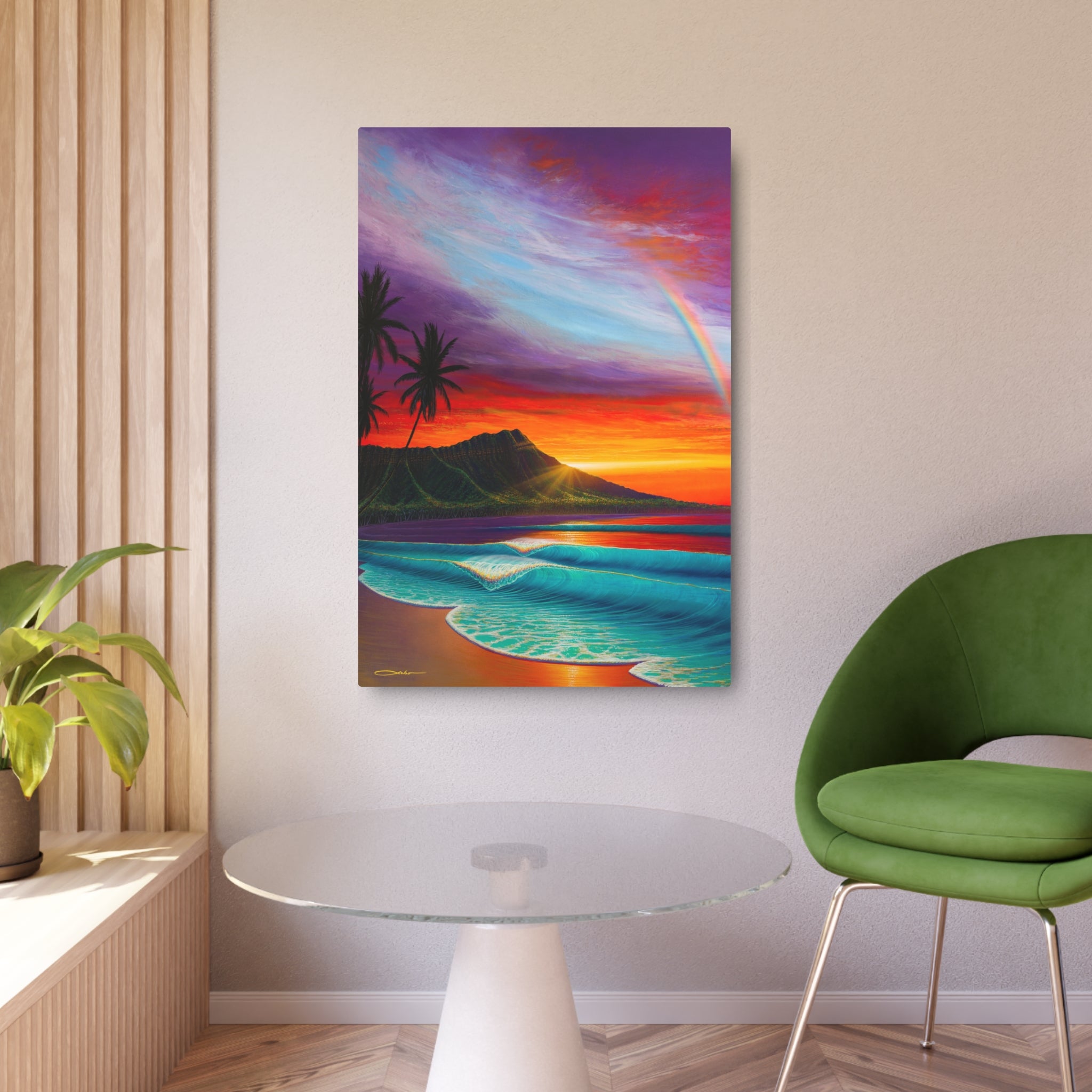 Bring a slice of vivid, sun-drenched shoreline into your home with this lightweight metal art sign. The matte-finished aluminum panel captures brilliant sunset hues, turquoise waves, swaying palms and a soft rainbow in finely printed detail. It hangs flush with a supplied mounting block and installs quickly with the included metal plate and double-sided tape. Choose from multiple sizes and orientations to fit a hallway, living room, or cozy reading nook — this piece adds a calm, tropical moment to everyday spaces and conjures slow evenings by the water.