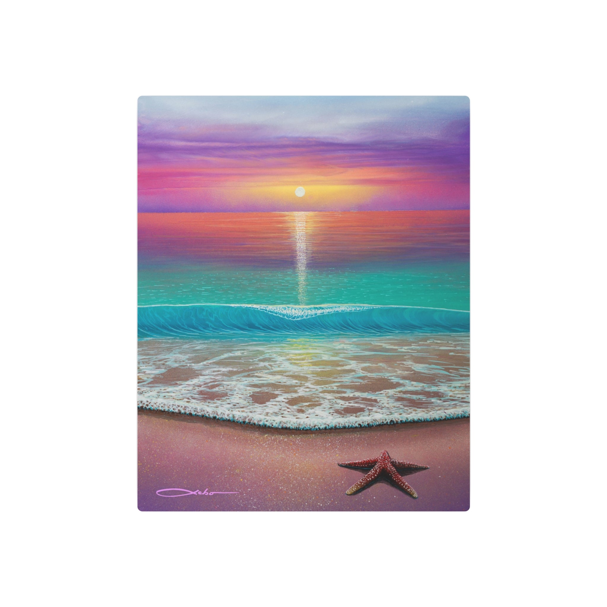 A calming metal art sign that brings a quiet shoreline into your space. Soft pastels bleed across a serene sunset, the sea reflecting lavender and peach hues while a lone starfish rests on the sand. Lightweight yet sturdy aluminum keeps colors vivid with a matte finish that reduces glare. Mount it vertically, horizontally, or square to add a moment of coastal calm to a hallway, reading nook, or bathroom. The included mounting block and tape let you place it quickly; a small, simple assembly completes the display. This piece feels like a slow exhale—an easy pause at the end of a busy day.