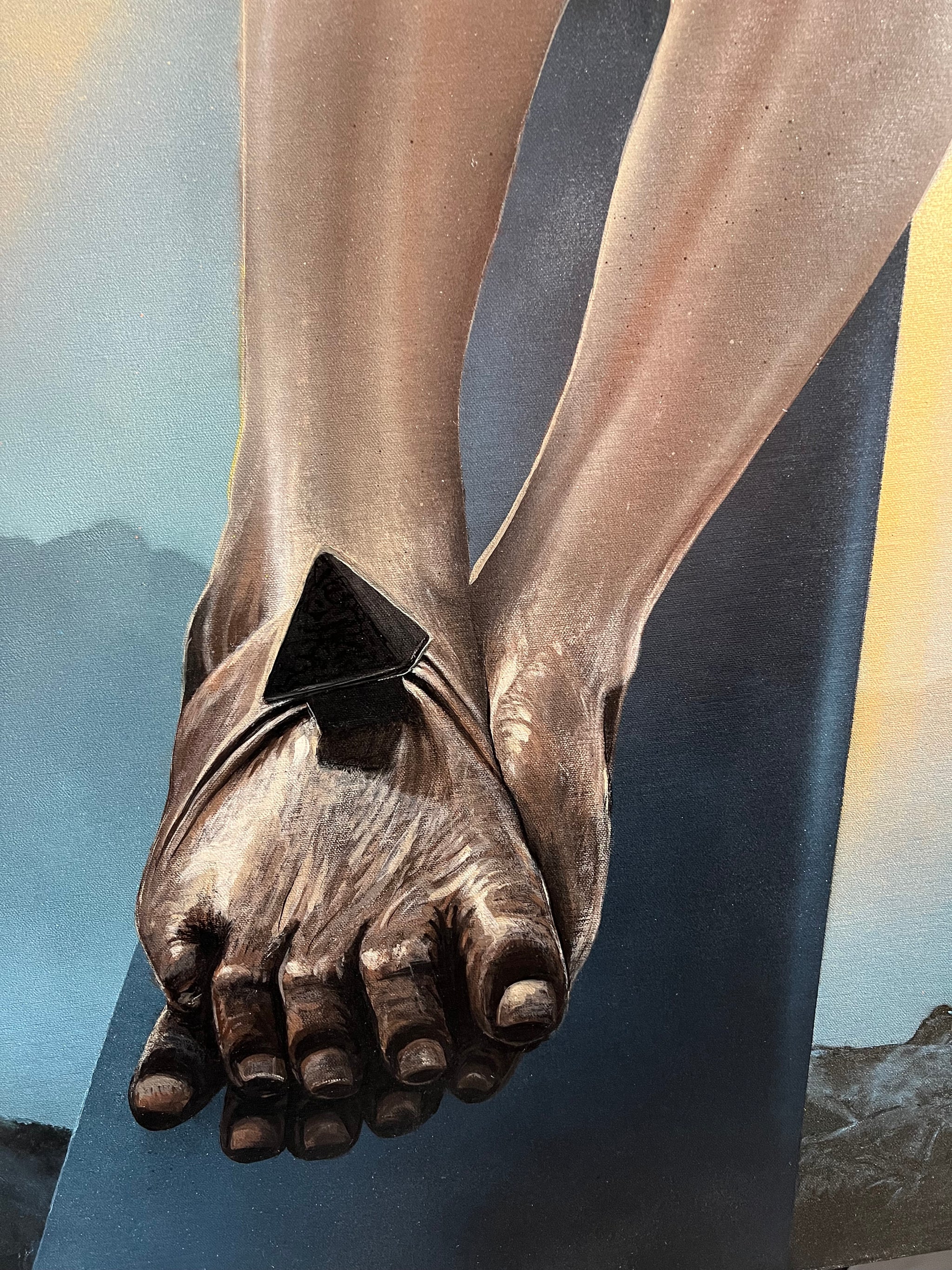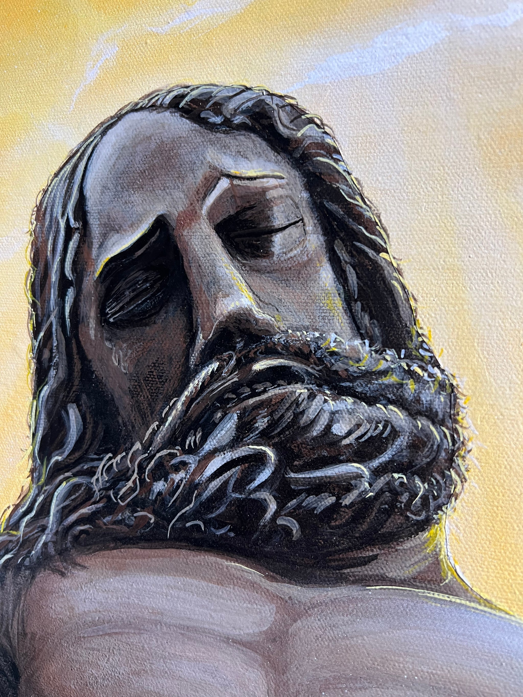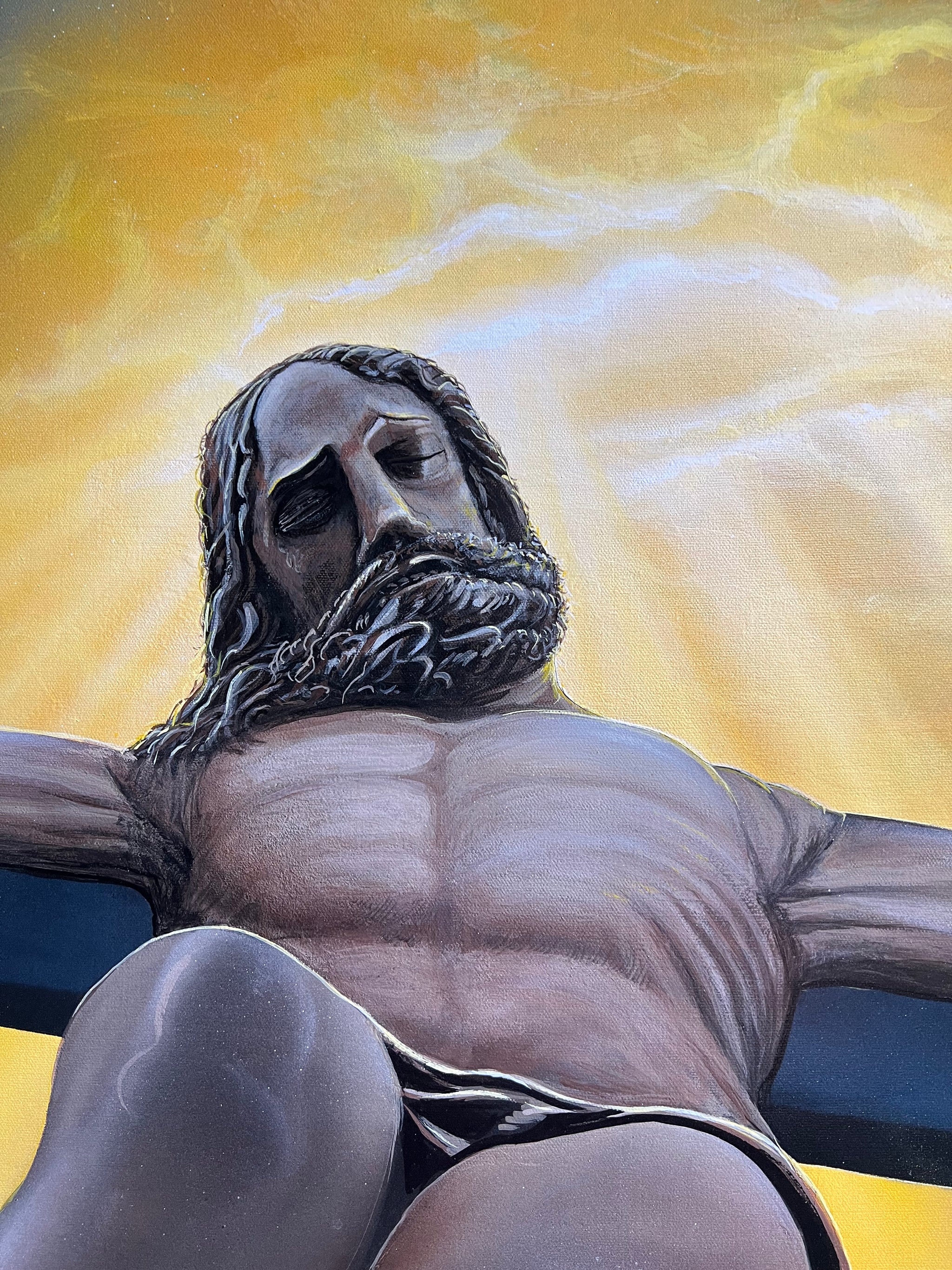 Inspired by my travels in Europe to many cathedrals and chapels. I found it interesting how the early artist would not put the crown of thorns on Jesus to show him triumph over death and I really like that idea. That’s also why there’s no blood on the body. Instead I gave him a crown of light from the heavens.