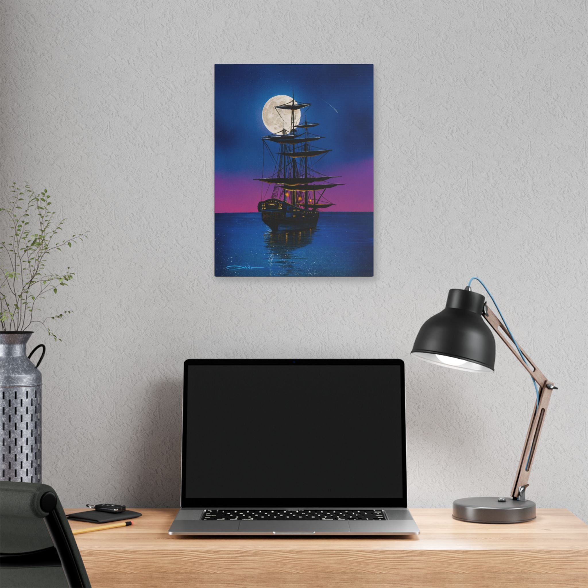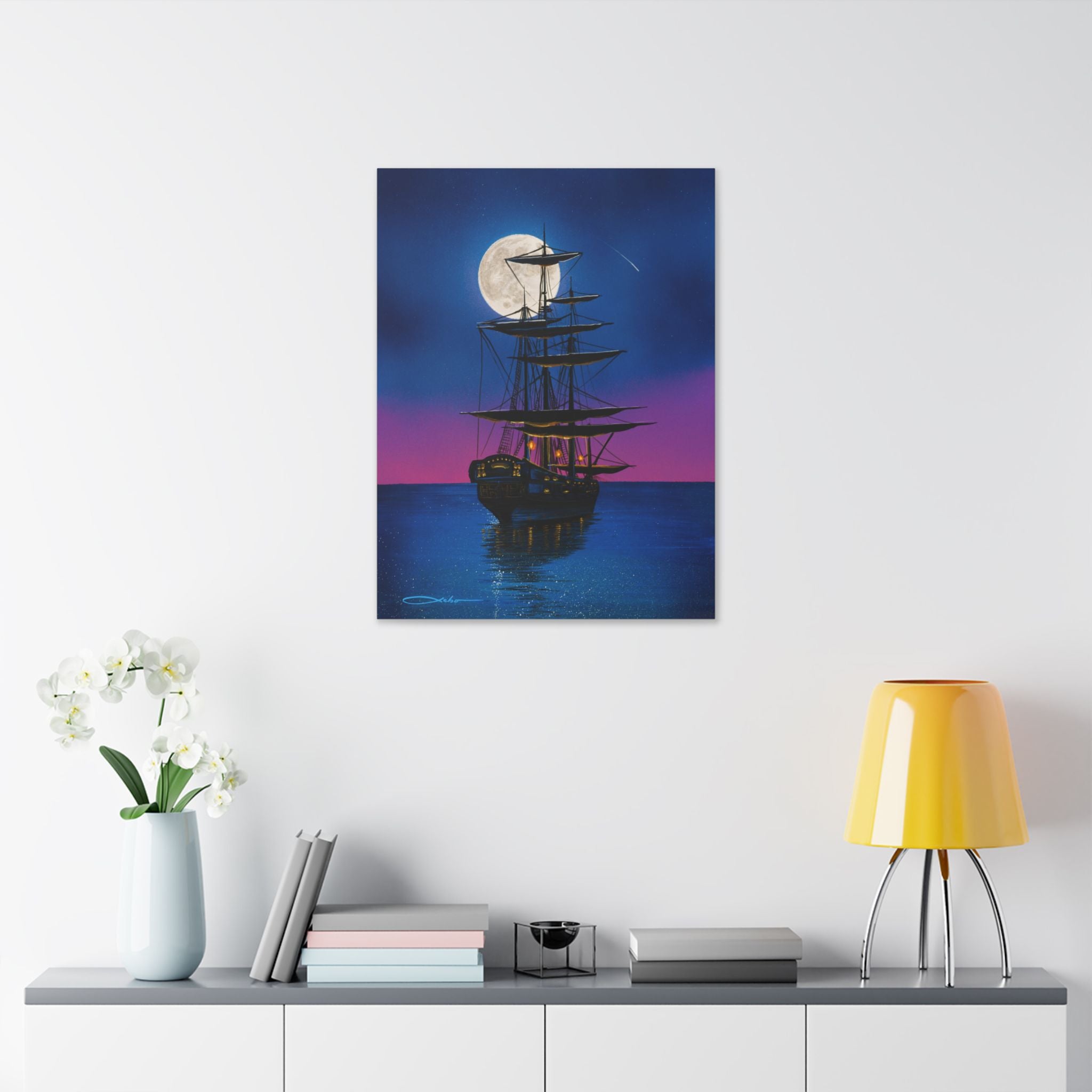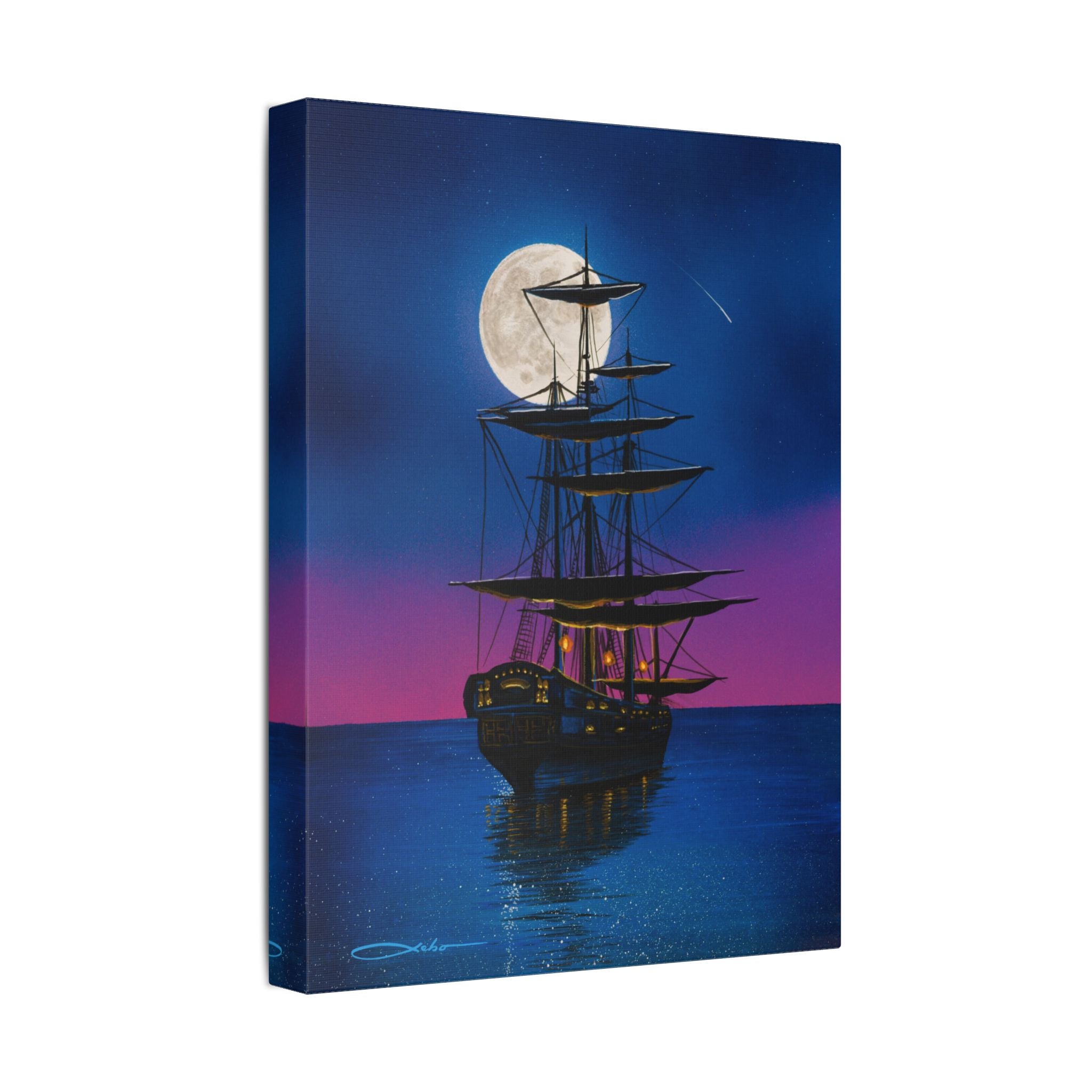 This stretched canvas brings a quiet sea-night into your room. Deep indigo and magenta gradients wrap around a pinewood frame, while a full moon and a lone tall ship anchor the scene in calm motion. The heavy 100% polyester weave catches light and keeps colors vivid; edges are printed so the image continues around the sides. Ready-to-hang with a sawtooth hanger and screws included, it arrives handcrafted and made to order in the UK/USA. Choose from multiple orientations and sizes to fit a hallway, study, or cozy reading nook — a contemplative focal point that settles into places where slow evenings and sea stories live.