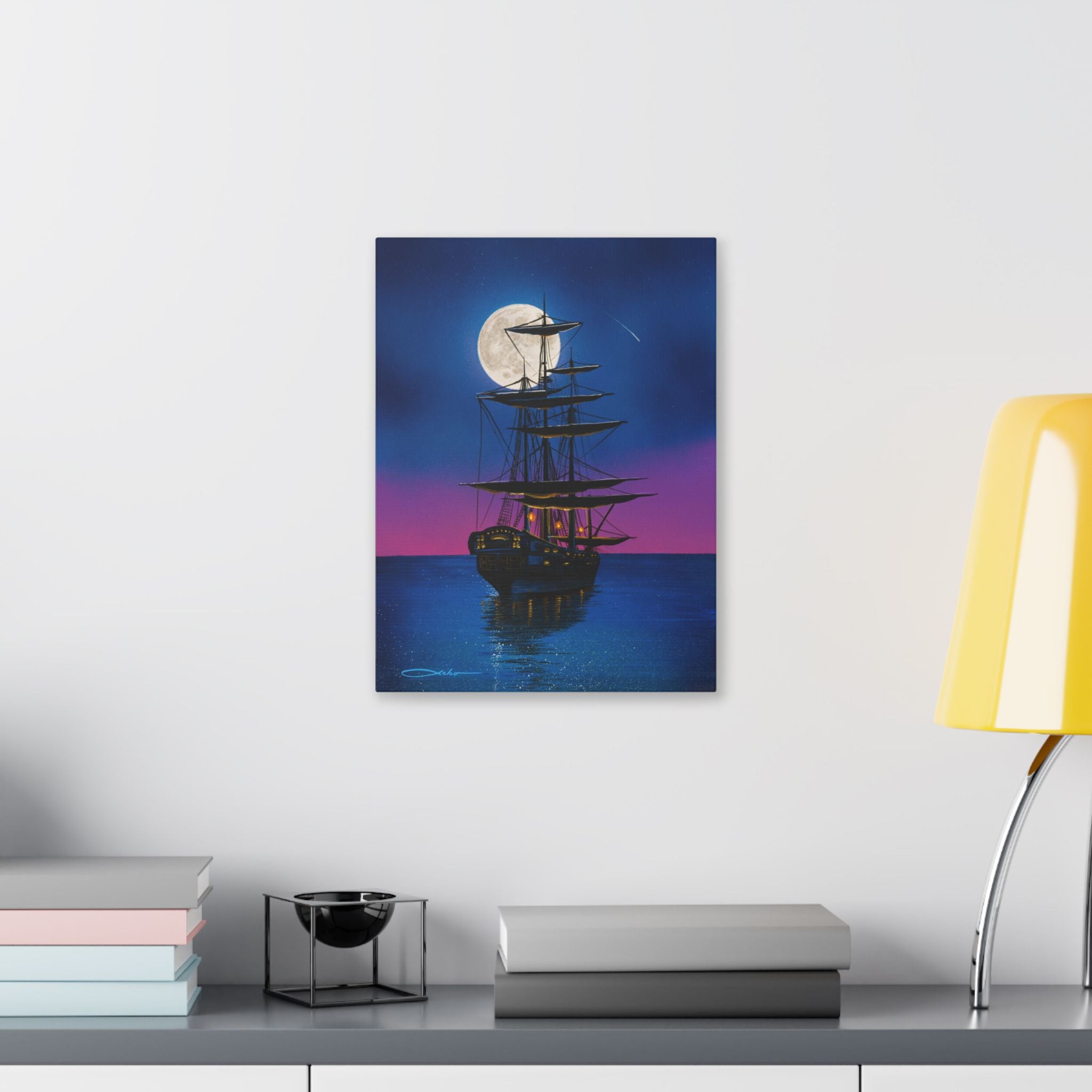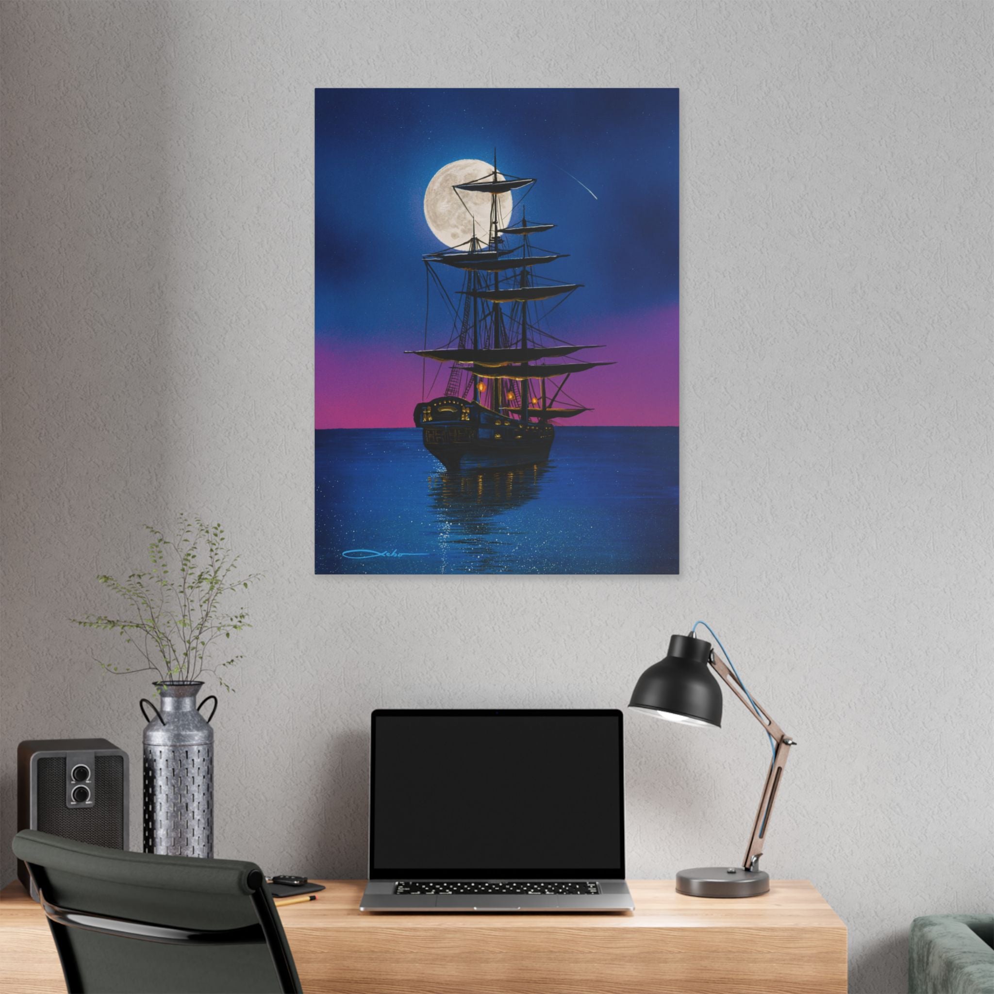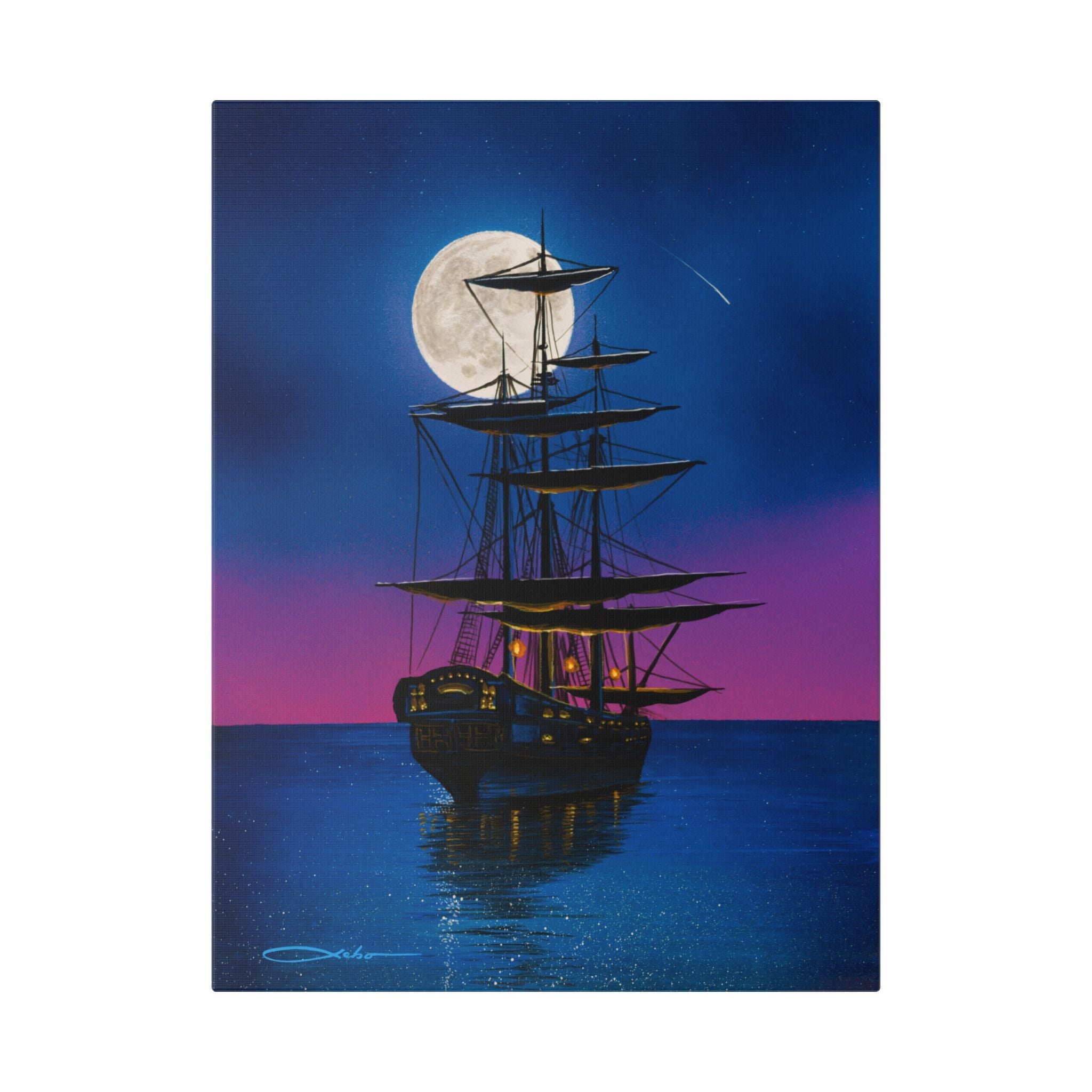 This stretched canvas brings a quiet sea-night into your room. Deep indigo and magenta gradients wrap around a pinewood frame, while a full moon and a lone tall ship anchor the scene in calm motion. The heavy 100% polyester weave catches light and keeps colors vivid; edges are printed so the image continues around the sides. Ready-to-hang with a sawtooth hanger and screws included, it arrives handcrafted and made to order in the UK/USA. Choose from multiple orientations and sizes to fit a hallway, study, or cozy reading nook — a contemplative focal point that settles into places where slow evenings and sea stories live.