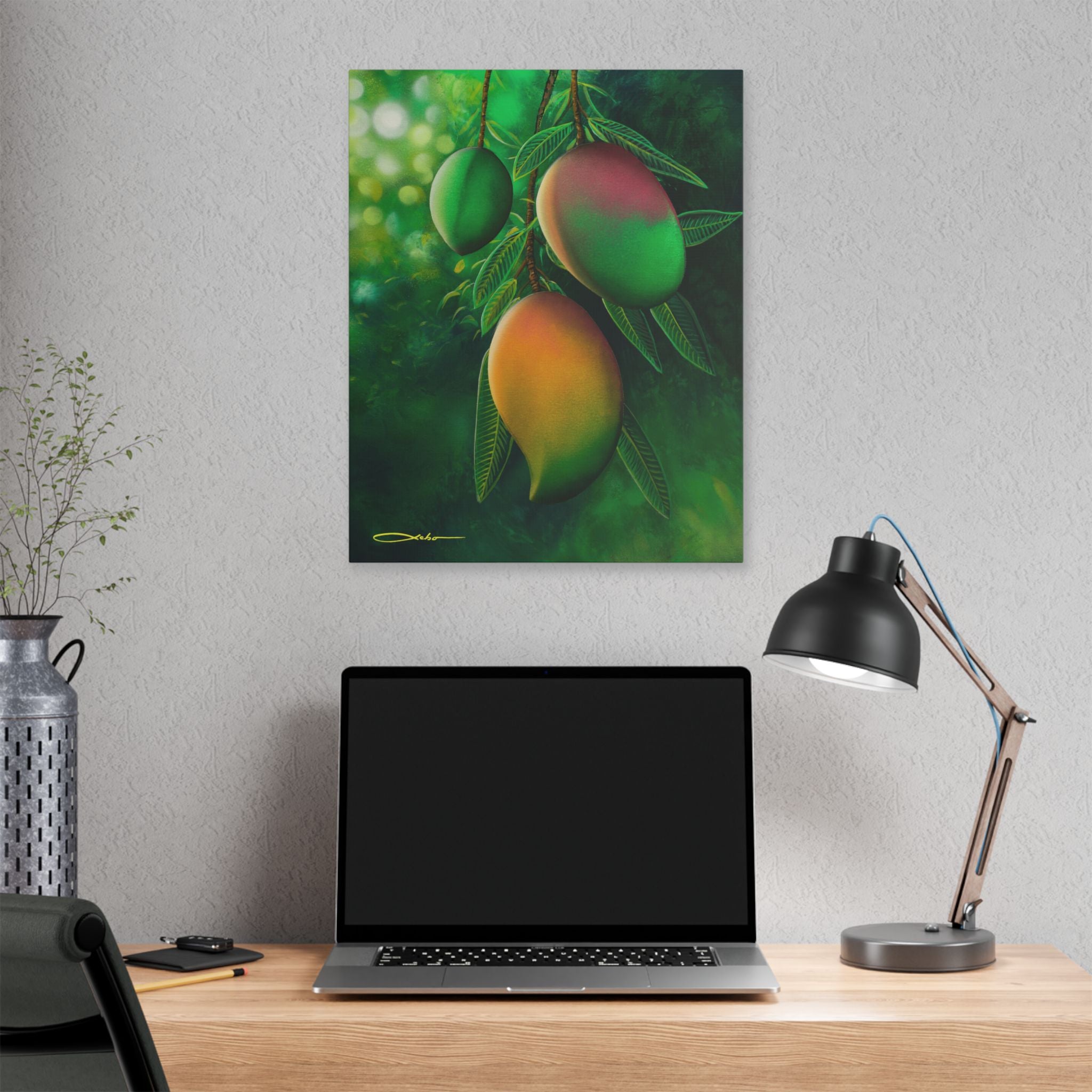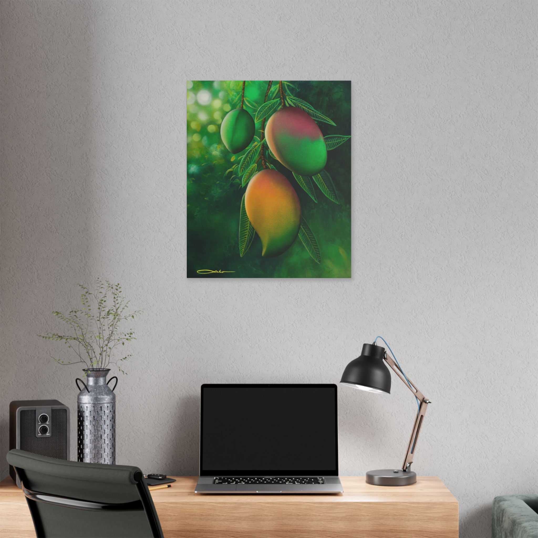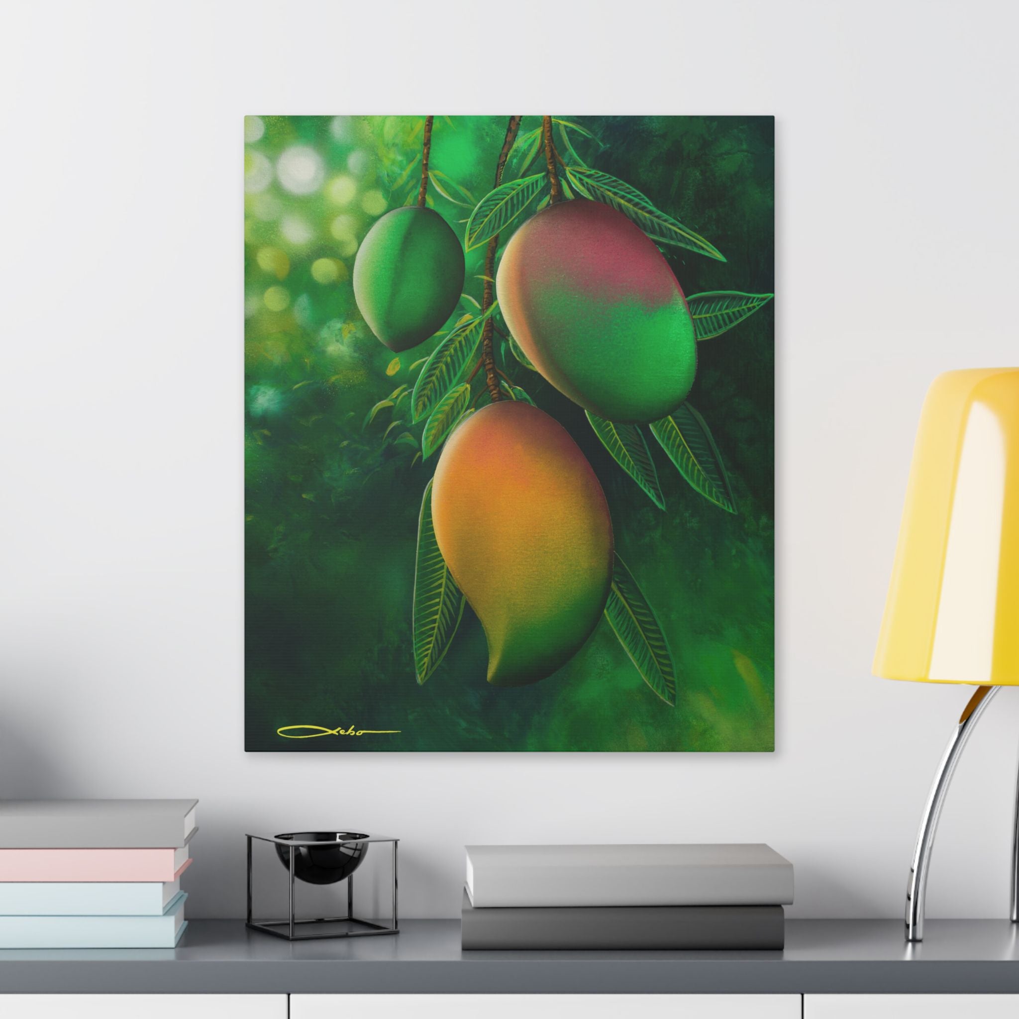 Sun-warmed mangoes hang heavy on a lush, green branch—each fruit glowing with sunset shades against a soft, bokeh forest background. This stretched canvas brings that warm, tropical hush into your space. The heavyweight polyester weave holds rich, saturated color and a slightly textured finish that reads like a painted original. Framed in natural pine and ready to hang, it settles above a kitchen table, brightens a reading nook, or anchors a sunlit hallway with calm, fruity energy.