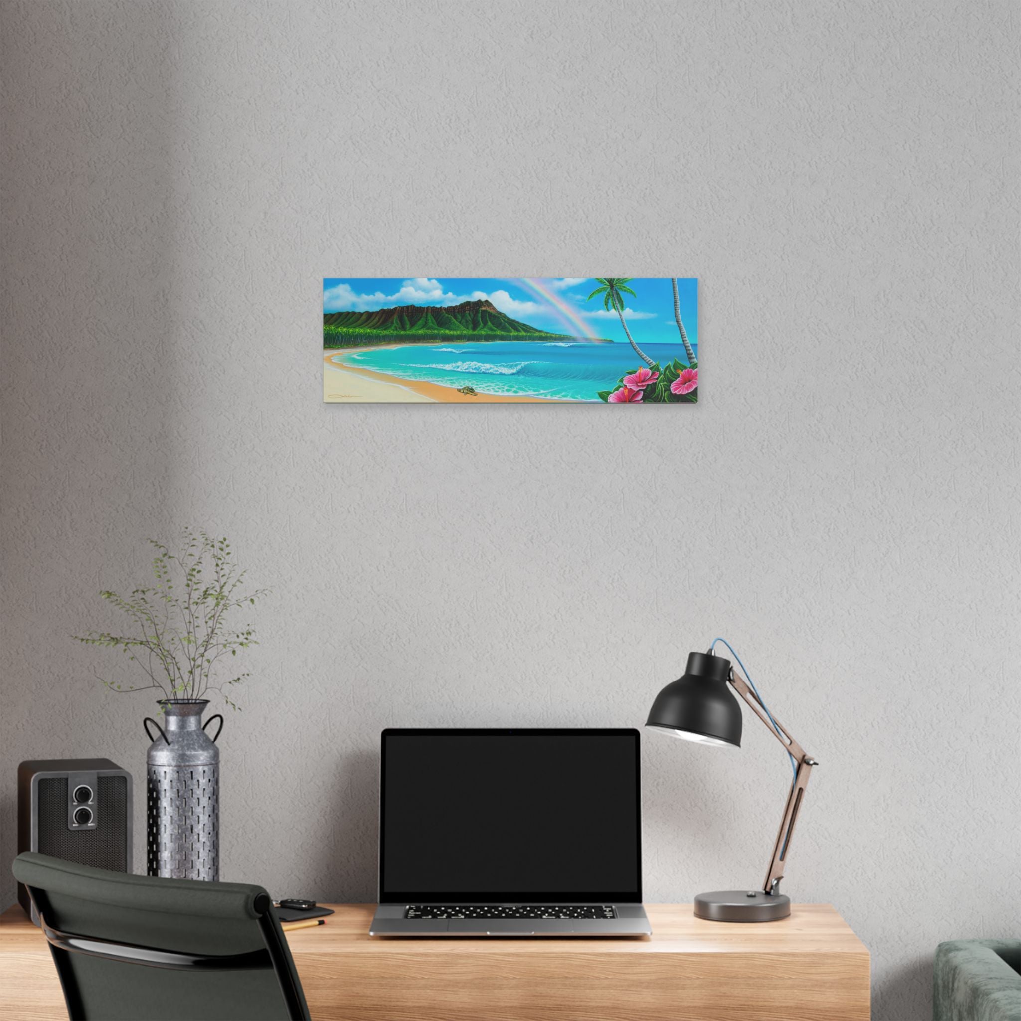 Bring a slice of shoreline into your space with this stretched canvas print. Bright turquoise waves curl toward a sunlit beach, framed by swaying palms, hibiscus blooms and a soft rainbow arching over distant cliffs. The vivid, painterly colors pop against the smooth polyester weave, and the slim pine frame gives the piece a warm, handcrafted feel. Hang it above a sofa, in a hallway or over a bedside table to summon calm, tropical energy and quiet daydreams of ocean breezes.