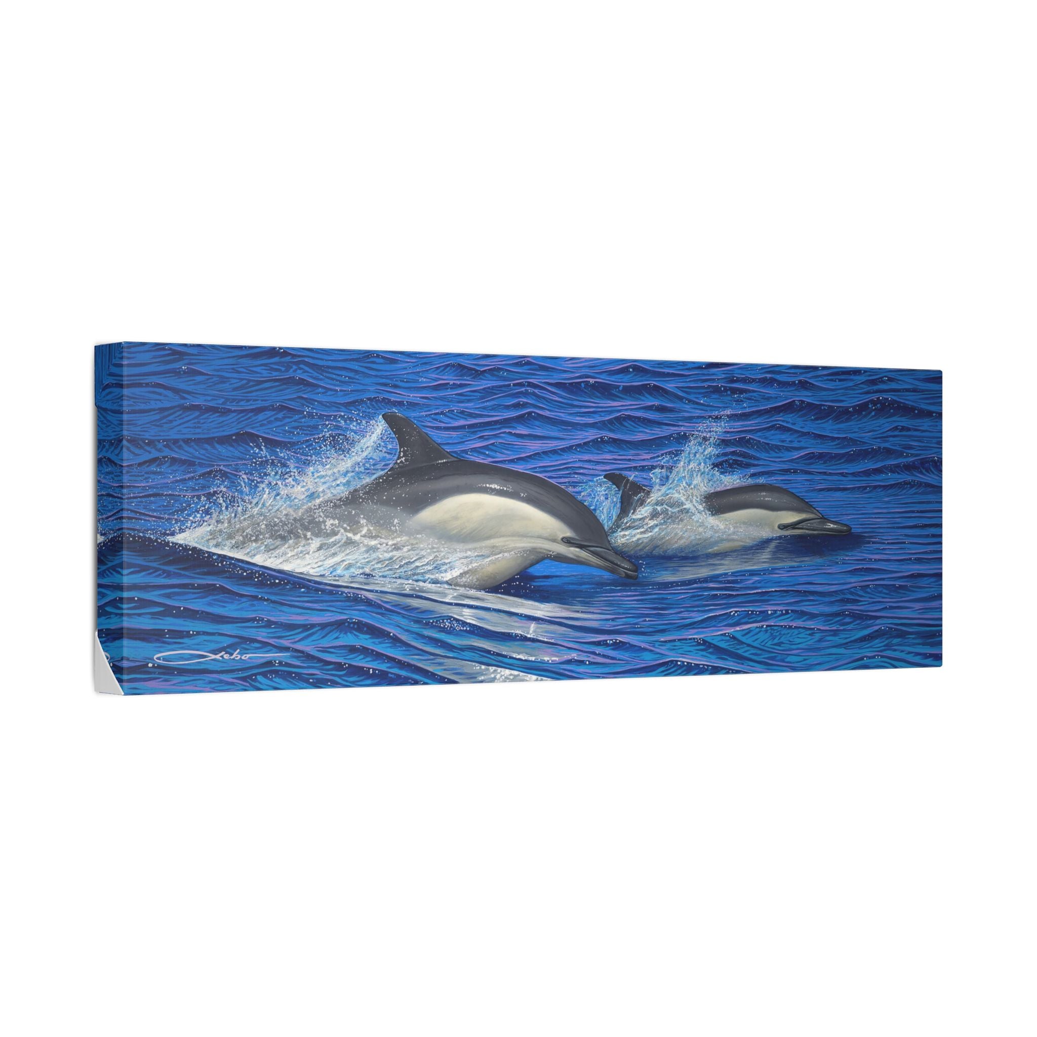 A stretched canvas print that brings the ocean into any room — vivid blues, lively spray, and the graceful motion of two dolphins captured mid-leap. The pinewood frame gives warm, natural structure while the heavy-weight polyester canvas keeps colors bright and textured for years. Hang it horizontally above a sofa, in a hallway, or in a beach house nook to summon calm, motion, and a touch of coastal wonder. Each piece is handcrafted to order in the UK/USA and ships with a hanging kit for quick installation.