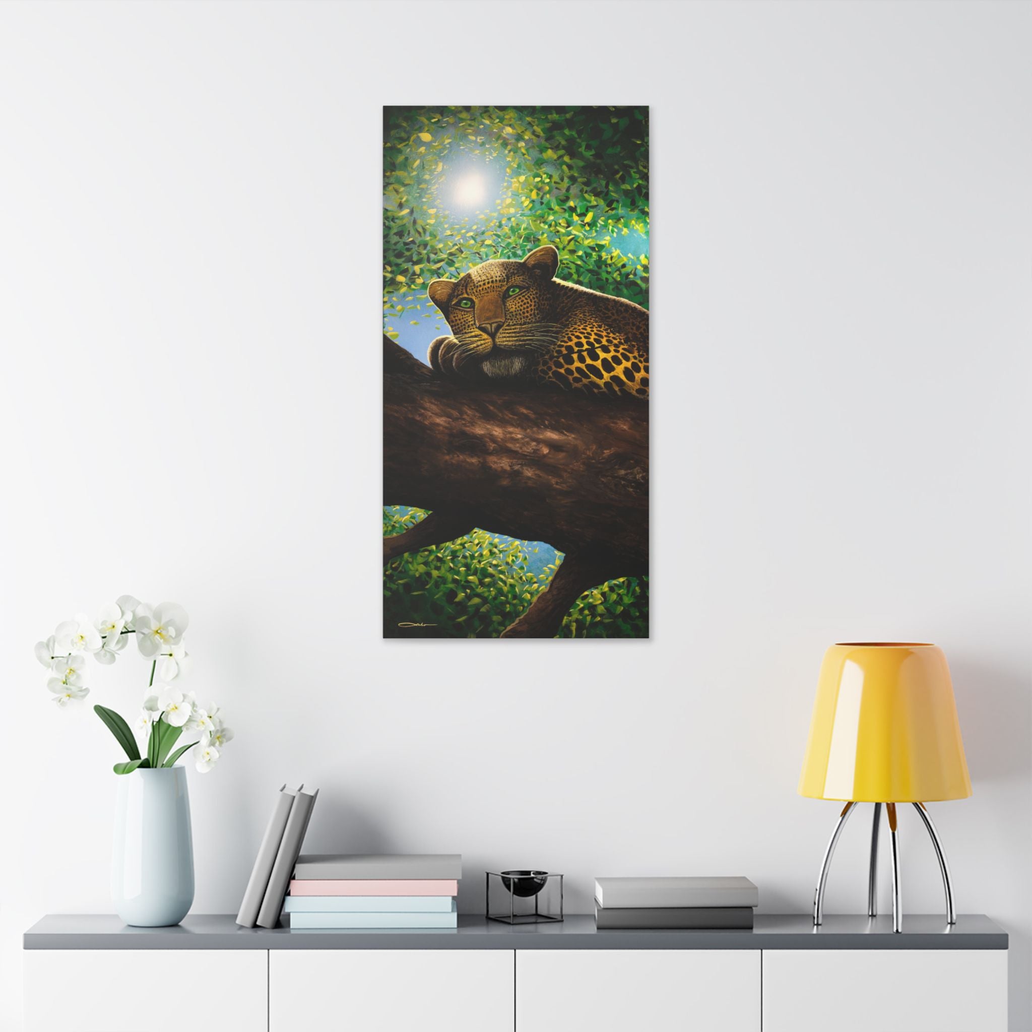 A stretched canvas print that brings a quiet jungle moment into your room. A watchful big cat lounges on a sunlit branch, dappled leaves and a glowing moonlike sun framing its steady gaze. The tall, vertical format feels like a secret window into the canopy — atmospheric, contemplative, and alive with color. Hang it on a narrow wall to add depth and calm, or group several sizes for a layered gallery wall that reads like a story of evening in the trees. The solid pine frame and vibrant polyester surface hold color and texture so the scene stays rich for years.