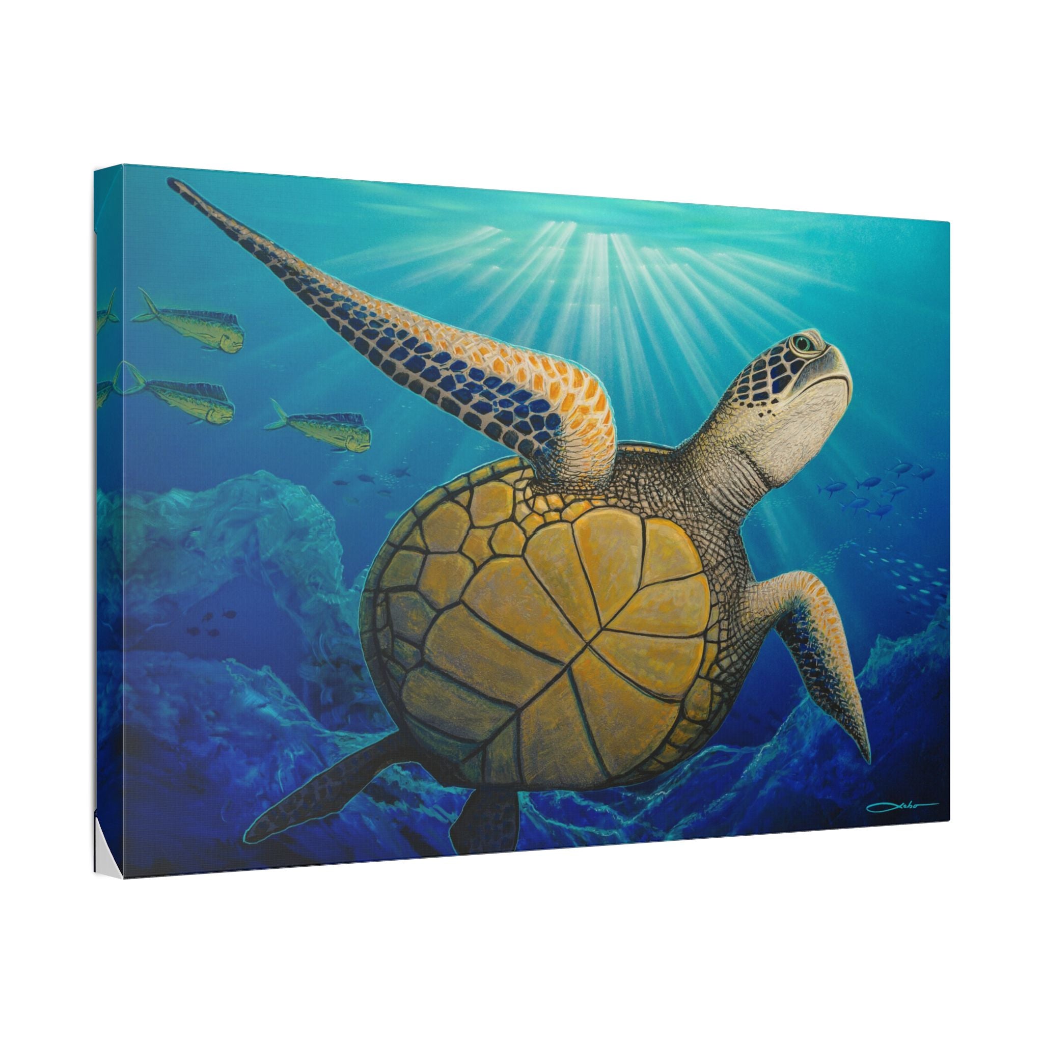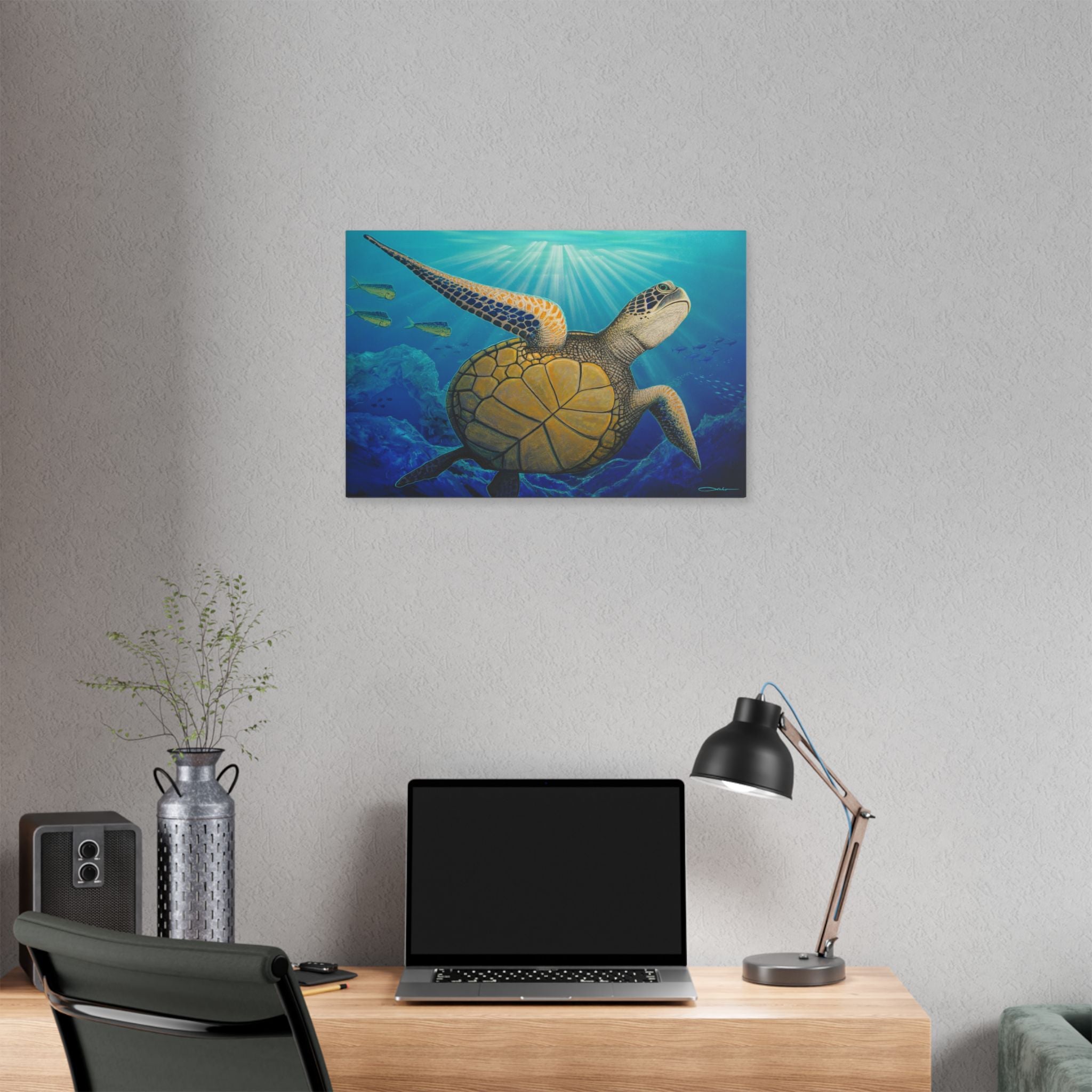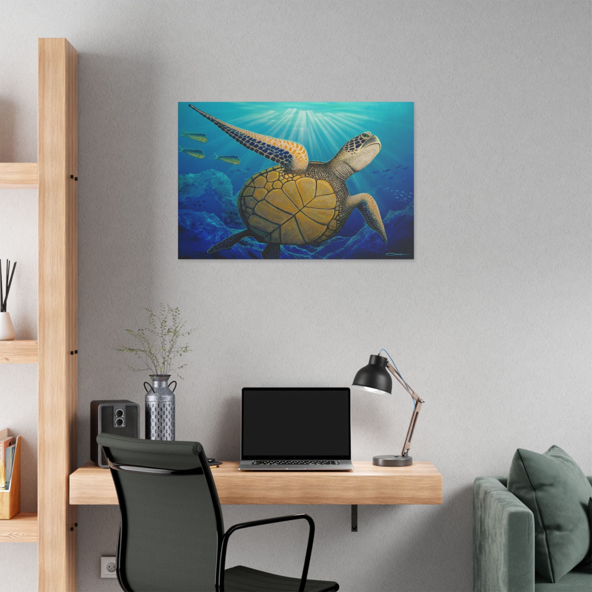 Dive into calm with this stretched canvas print featuring a graceful sea turtle drifting through sunlit blue waters. The vivid blues and golden shell glow with crisp, modern color that brings ocean depth into any room. Handcrafted on a sturdy pinewood frame, the textured polyester canvas holds every brushstroke and light ray — it feels like a quiet underwater moment suspended on your wall. Hang it in a living room, beach house, or study to bring a slow, restorative rhythm to your space and remind you of long, saline afternoons and gentle currents.