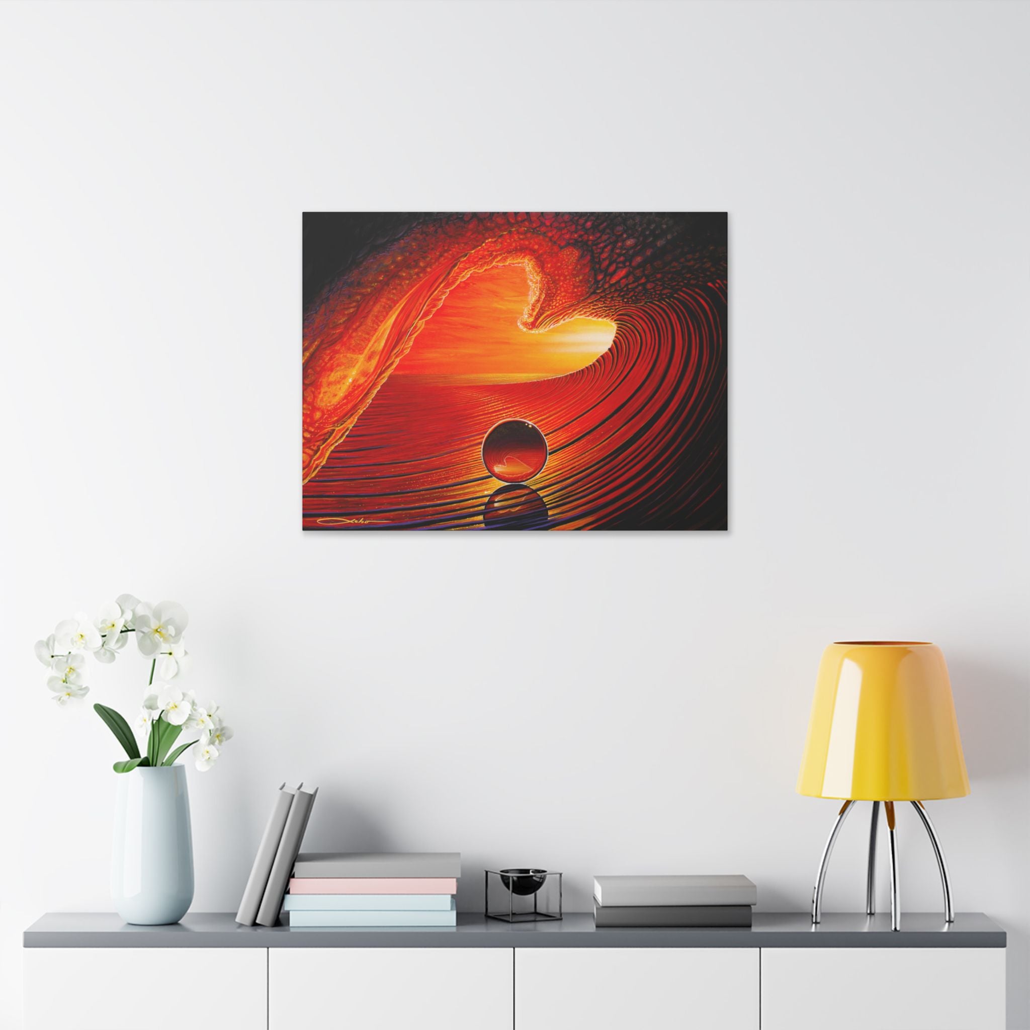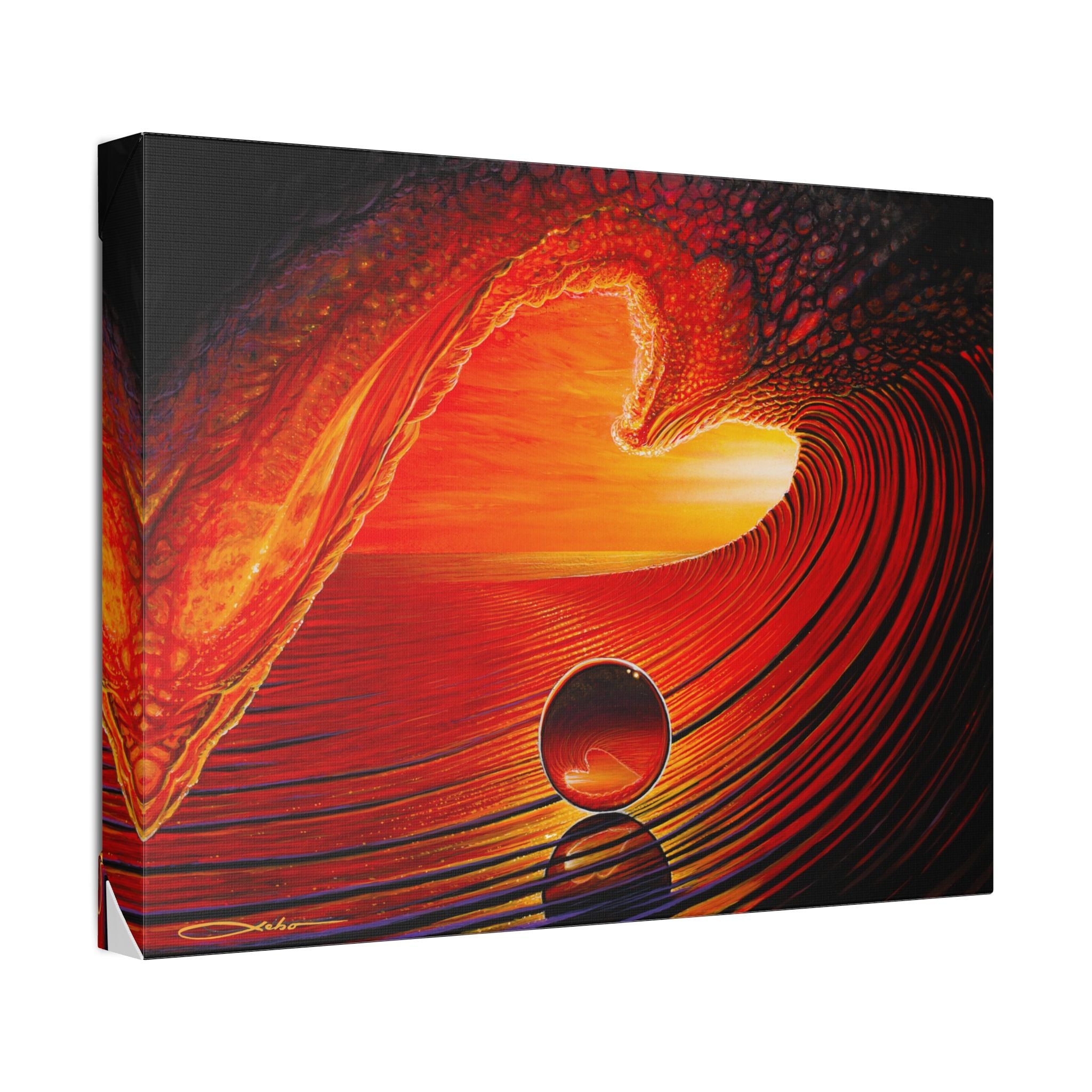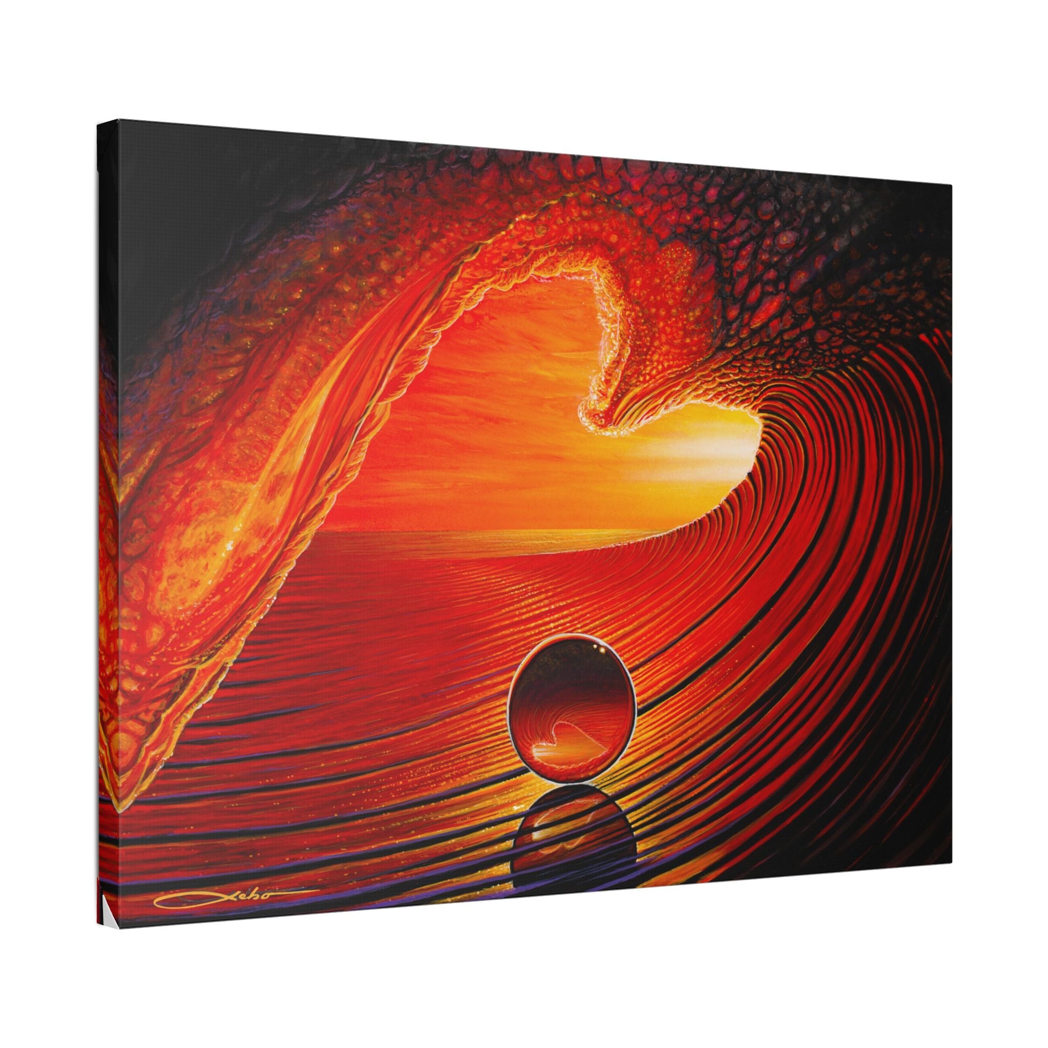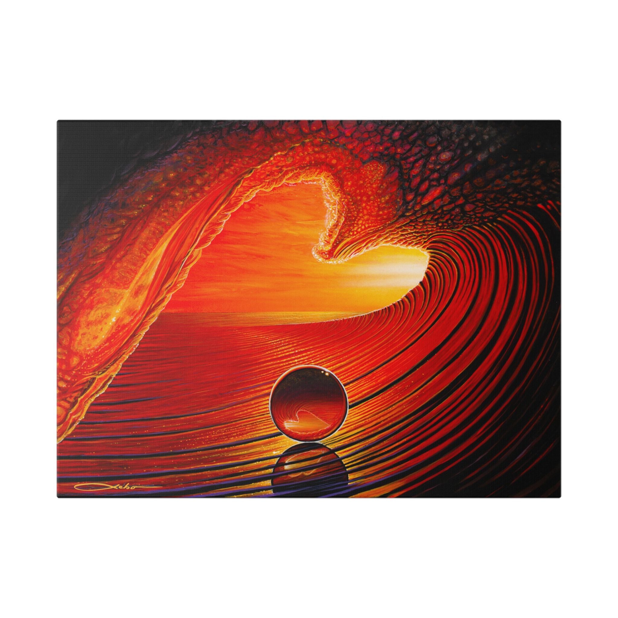 A vivid stretched canvas that brings molten color and motion into a room. The warm reds and golds ripple across a luxurious polyester surface, creating a sense of depth and light that feels almost alive. Mounted on a sturdy pinewood frame and ready to hang, this canvas turns a blank wall into a focal point — a conversation starter that suggests sunset warmth, fluid movement, and quiet reflection. Handcrafted to order in the UK/USA, each piece keeps its sharp color and texture over time so the scene stays rich for years.