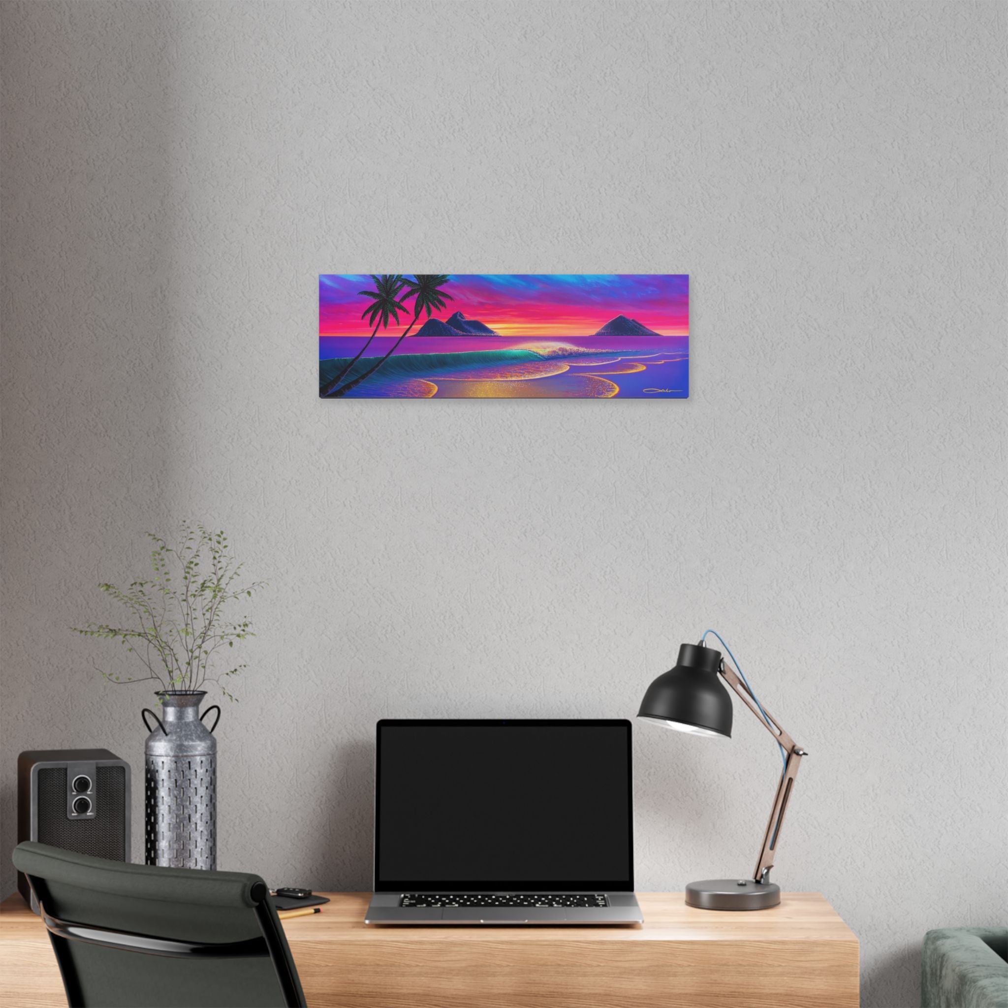 Turn a wall into a sunset memory with this stretched canvas that brings tropical evenings home. Bold magentas, deep purples and neon golds glow across a wide panoramic scene — palm silhouettes, gentle islands, and a shimmering shoreline drawn in smooth, cinematic strokes. Hung above a sofa or along a hallway, the canvas reads like a quiet vacation: warm air, soft waves, and that slow hush as day slides into night. It adds an instant mood shift for anyone who collects travel moments, beach-house color, or mid-century inspired coastal art.
